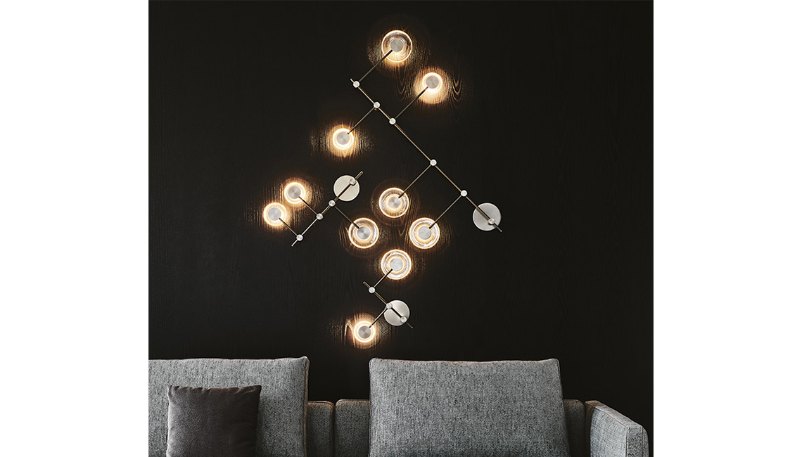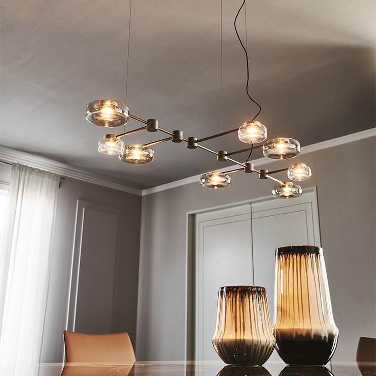 Ceiling and wall lamp with frame in titanium embossed lacquered steel (GFM11) and satin Nickel. Small lampshade in borosilicate transparent glass, big lampshade in borosilicate fumé glass. Integrated LED light.