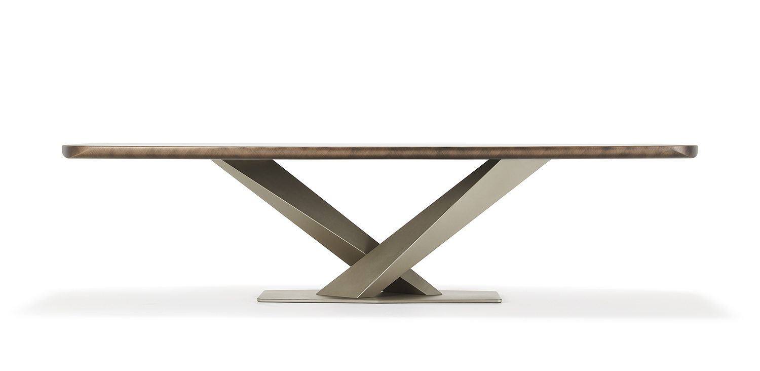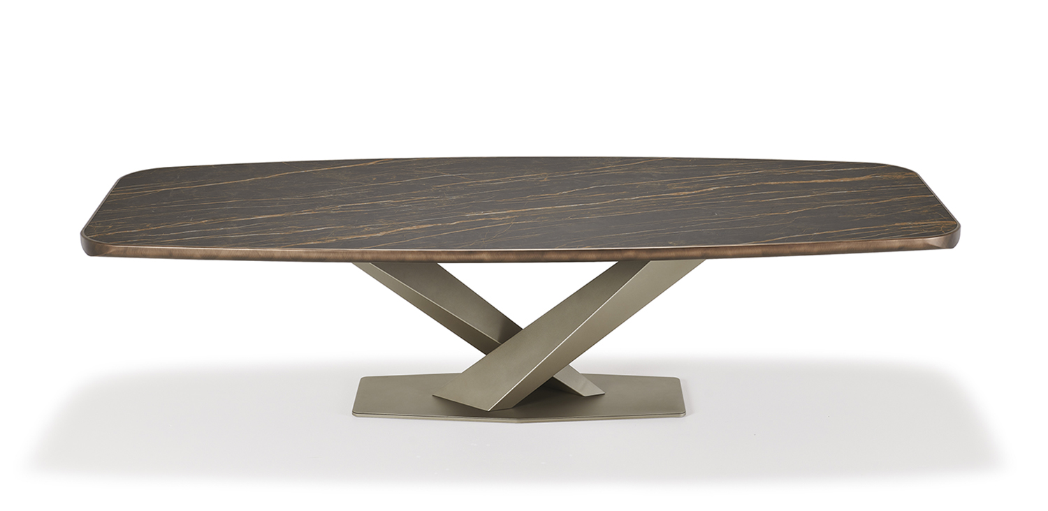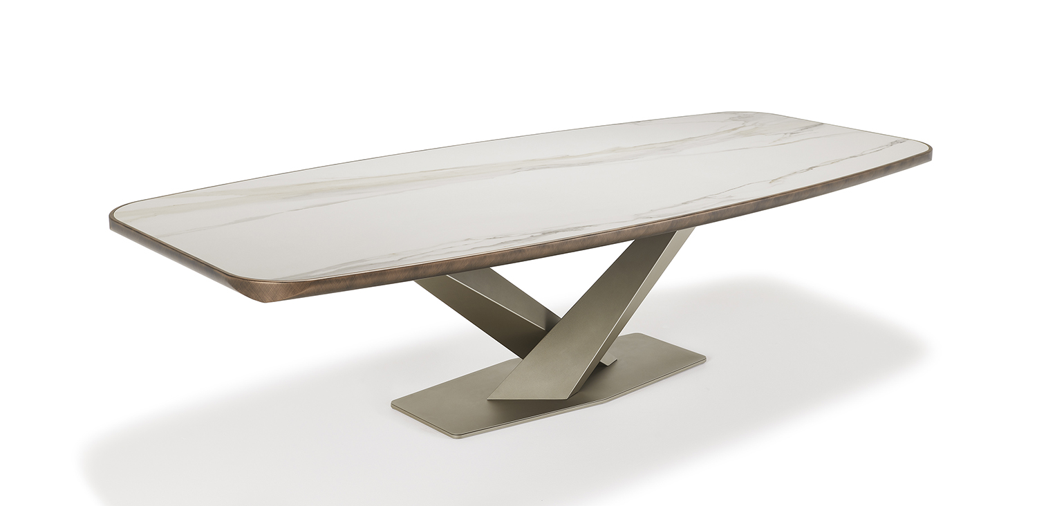 Table with base in titanium (GFM11), bronze (GFM18), graphite (GFM69) or black (GFM73) embossed lacquered steel. Top in ceramic Marmi Calacatta (KM01), Alabastro (KM02), Ardesia (KM04), matt Golden Calacatta (KM05), glossy Golden Calacatta (KM06), matt Portoro (KM07), glossy Portoro (KM08), glossy Sahara Noir (KM09), Emperador (KM10), Makalu (KM11), Breccia (KM12) or Arenal (KM13) with black or Brushed Bronze lacquered and rounded lower profile. 6cm thick wooden top on 300x128 version and 5cm on 200x120 and 240x120 versions.