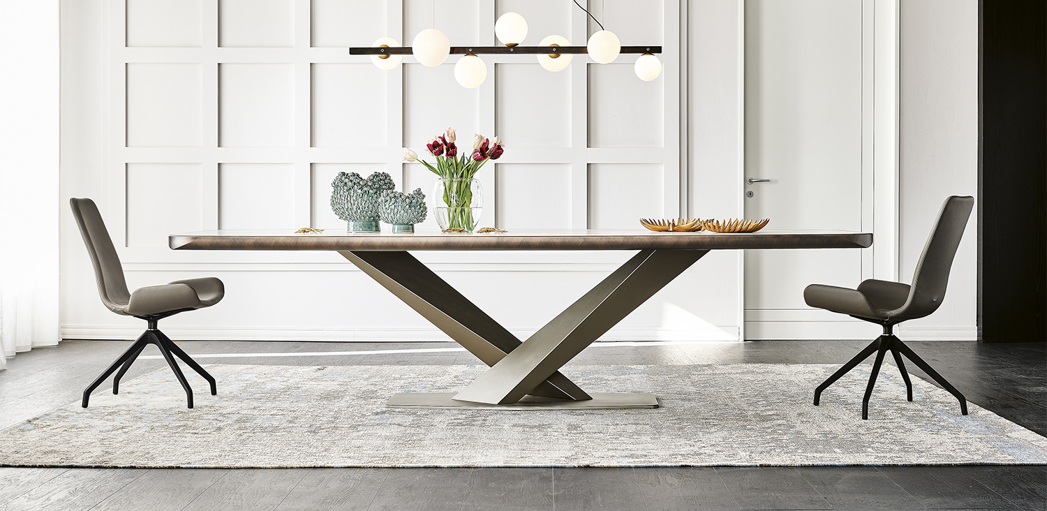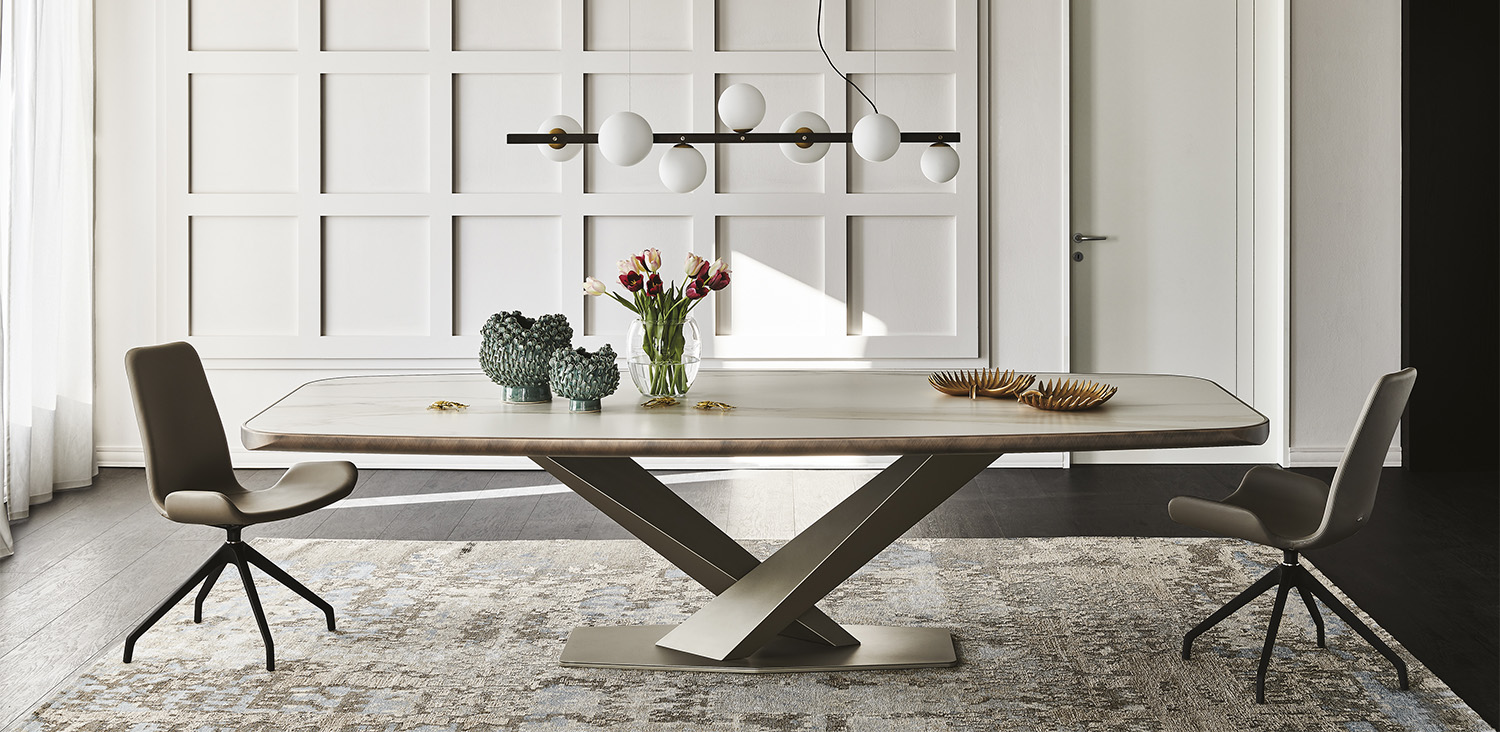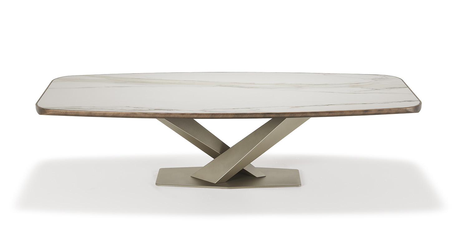 Table with base in titanium (GFM11), bronze (GFM18), graphite (GFM69) or black (GFM73) embossed lacquered steel. Top in ceramic Marmi Calacatta (KM01), Alabastro (KM02), Ardesia (KM04), matt Golden Calacatta (KM05), glossy Golden Calacatta (KM06), matt Portoro (KM07), glossy Portoro (KM08), glossy Sahara Noir (KM09), Emperador (KM10), Makalu (KM11), Breccia (KM12) or Arenal (KM13) with black or Brushed Bronze lacquered and rounded lower profile. 6cm thick wooden top on 300x128 version and 5cm on 200x120 and 240x120 versions.