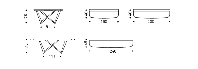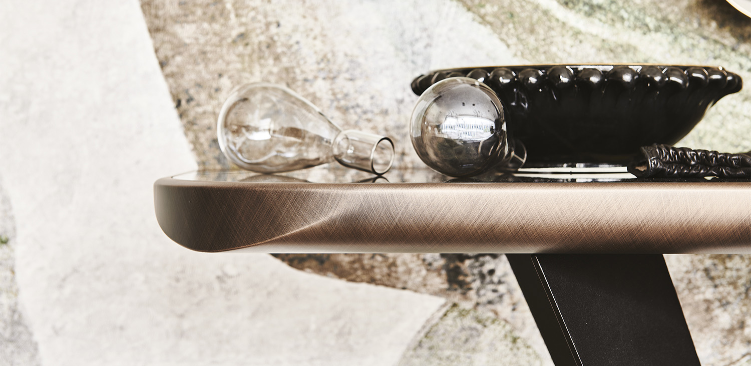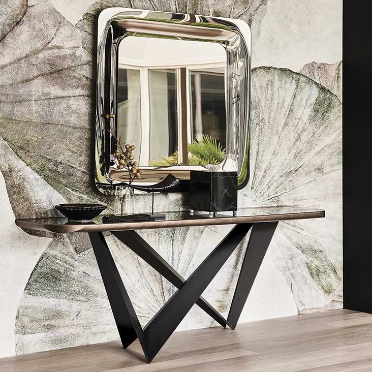 Console with base in titanium (GFM11), white (GFM71), graphite (GFM69), black (GFM73) or mix (GFM69-GFM71) embossed lacquered steel or Brushed Bronze. Top in ceramic Marmi Calacatta (KM01), Alabastro (KM02), Ardesia (KM04), matt Golden Calacatta (KM05), glossy Golden Calacatta (KM06), matt Portoro (KM07), glossy Portoro (KM08), glossy Sahara Noir (KM09), Emperador (KM10) or Makalu (KM11) with black or Brushed Bronze lacquered and rounded lower profile. Wall anchorage is necessary. 5cm thick wooden top.