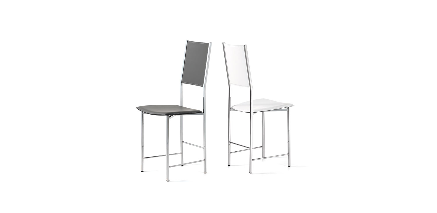 Chair with frame in chromed steel (08) or black chrome (06), black (OP17), white (OP71), graphite (OP69) painted steel. Back and seat in leather as per sample card. Standard stitching.