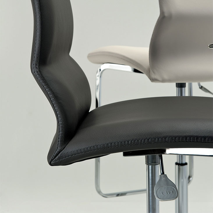 Swiveling ultralight stool, adjustable in height with 4 spokes base in polished aluminium and column, footrest and gas piston in chromed steel (08) or with base plate, column, and footrest in black (GFM73) or titanium (GFM11) embossed lacquered steel and gas piston in chromed steel (08). Frame covered in fabric, synthetic nubuck, micro nubuck, synthetic leather, or soft leather as per sample card. -- The new lowered piston allows the use of the stool as a chair --