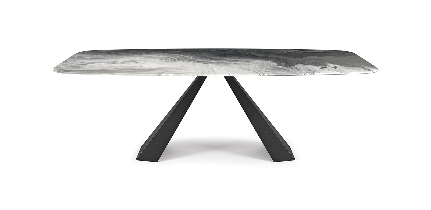 Table with base in titanium (GFM11), bronze (GFM18), graphite (GFM69), white (GFM71) or black (GFM73) embossed lacquered steel. Top 12mm thick in extra clear bevelled glass with artistic decorative printing in two different colours (CY01, CY02).