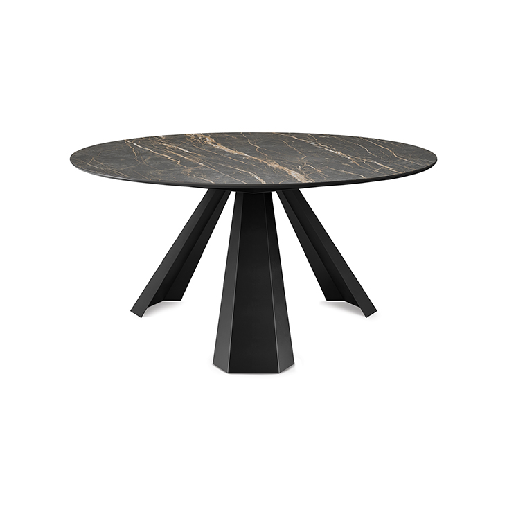 Table with base in titanium (GFM11), bronze (GFM18), graphite (GFM69) white (GFM71), black (GFM73) or embossed lacquered steel. Marmi Calacatta (KM01), Alabastro (KM02), Ardesia (KM04), matt Golden Calacatta (KM05), glossy Golden Calacatta (KM06), matt Portoro (KM07), glossy Portoro (KM08), glossy Sahara Noir (KM09), Emperador (KM10), Makalu (KM11), Breccia (KM12) or Arenal (KM13) ceramic top. Optional central swiveling tray Lazy Susan.