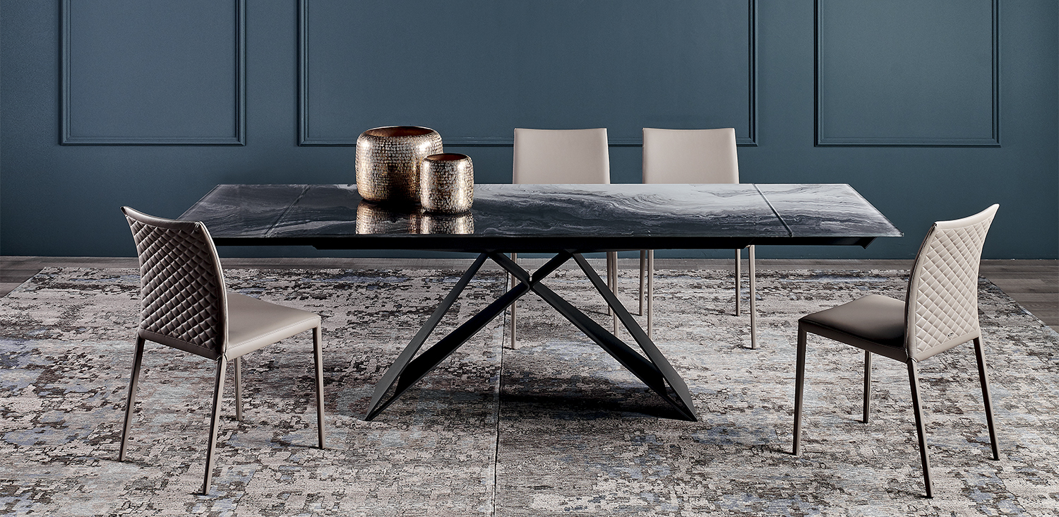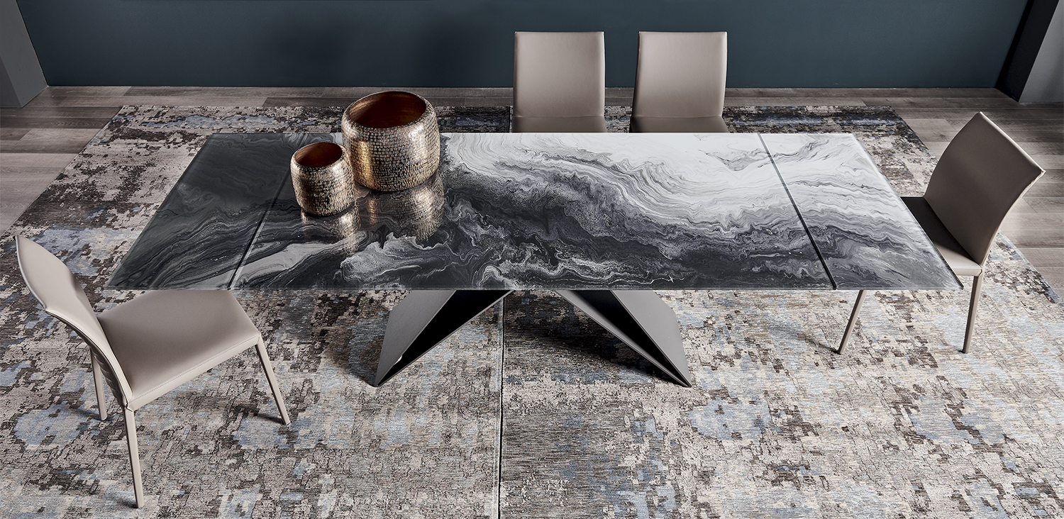 Extendible table with base in titanium (GFM11), bronze (GFM18), graphite (GFM69), black (GFM73) embossed lacquered steel. Top and extensions in 12mm extra clear glass with artistic decorative printing in two different colours (CY01, CY02).