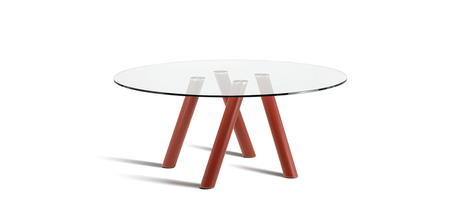 Table with base in chromed steel (08), black chrome (06), painted matt white (OP71), matt graphite (OP69) or covered in leather as per sample card. Top in 15mm tempered clear glass.