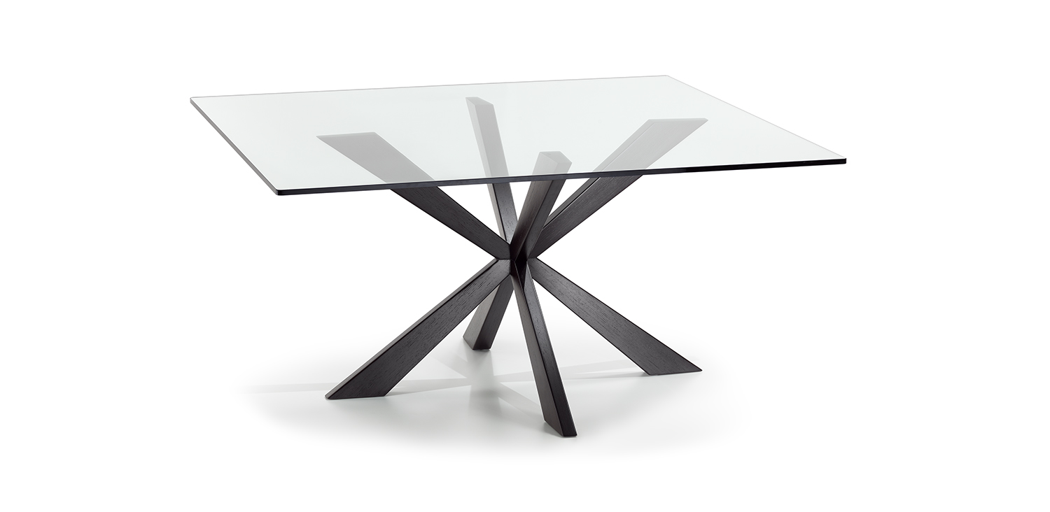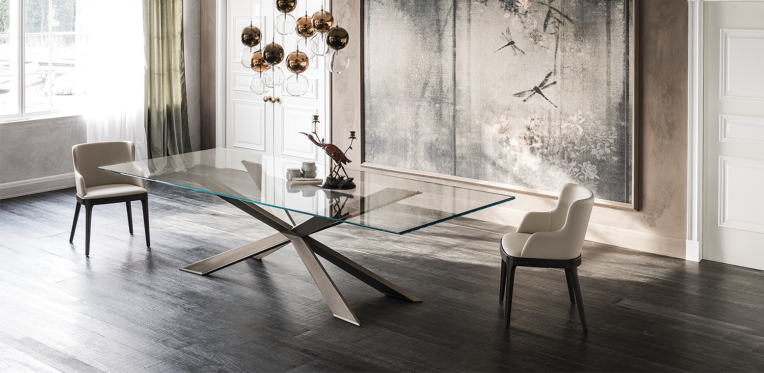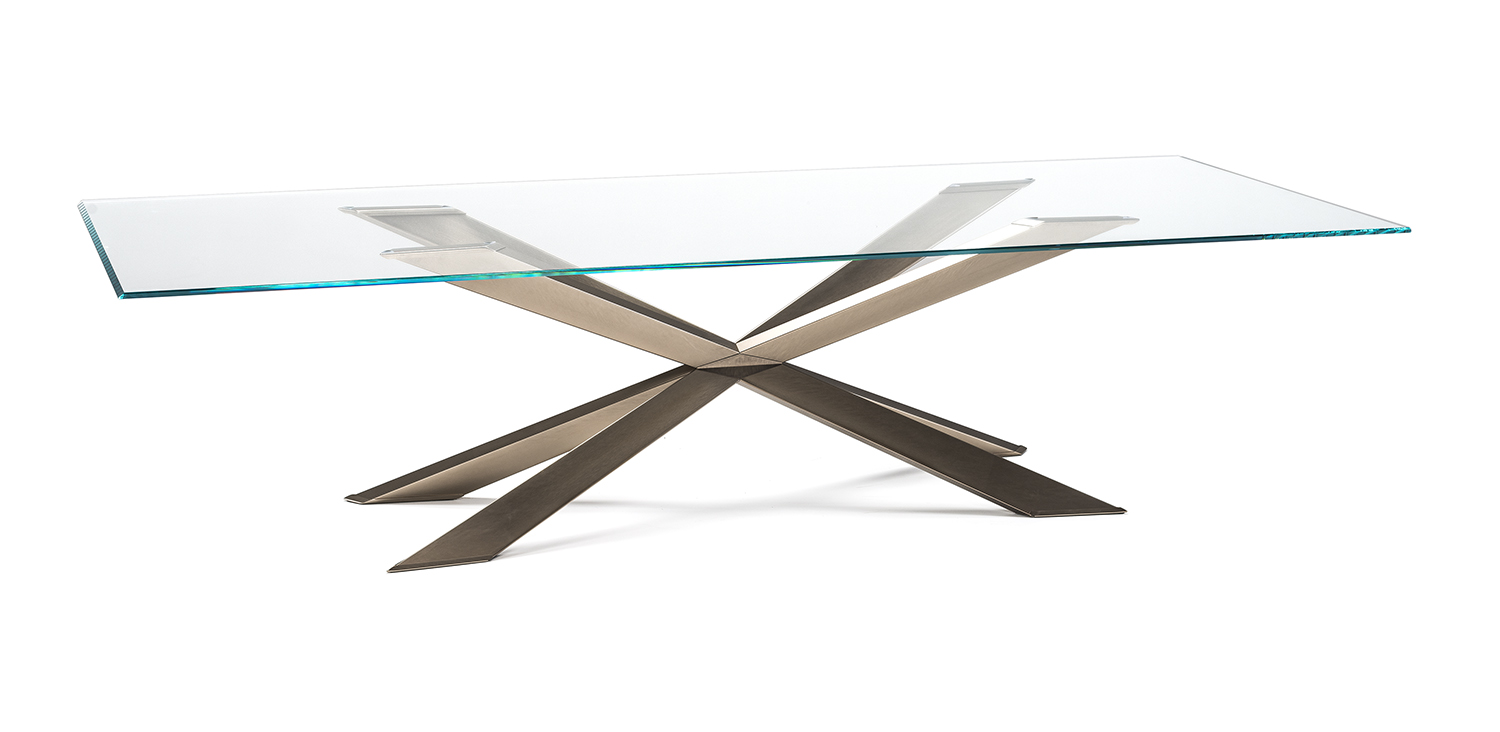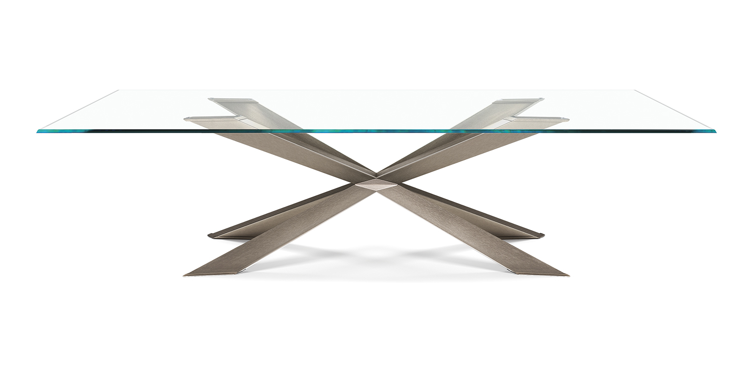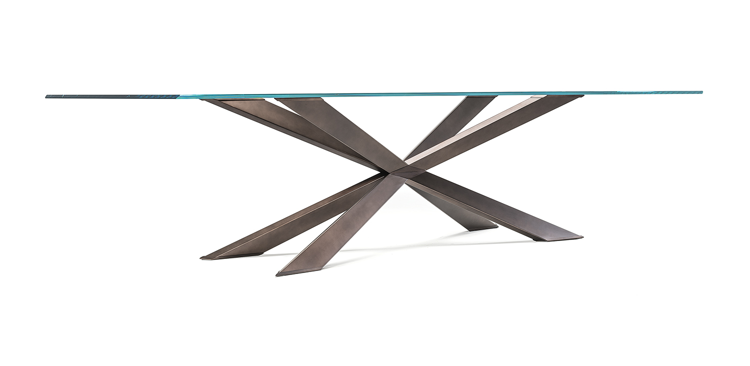 Table with base in matt black (OP17), graphite (OP69), white (OP71) painted steel, or in weathered brass or polished stainless steel, or in satin bronze (15), satin titanium (11) painted steel, or with wooden base in Canaletto walnut (NC), dark Wenghè (W2) or Heritage oak (HR). Top in 15mm clear, extra clear or extra clear glass with reversed bevelled edges, laid on the base. Glass top 12mm on 200x106 and 182x90 version. Small reflection irregularities on the stainless steel base or glazes on the satin titanium or satin bronze painted base are due to handmade processing.