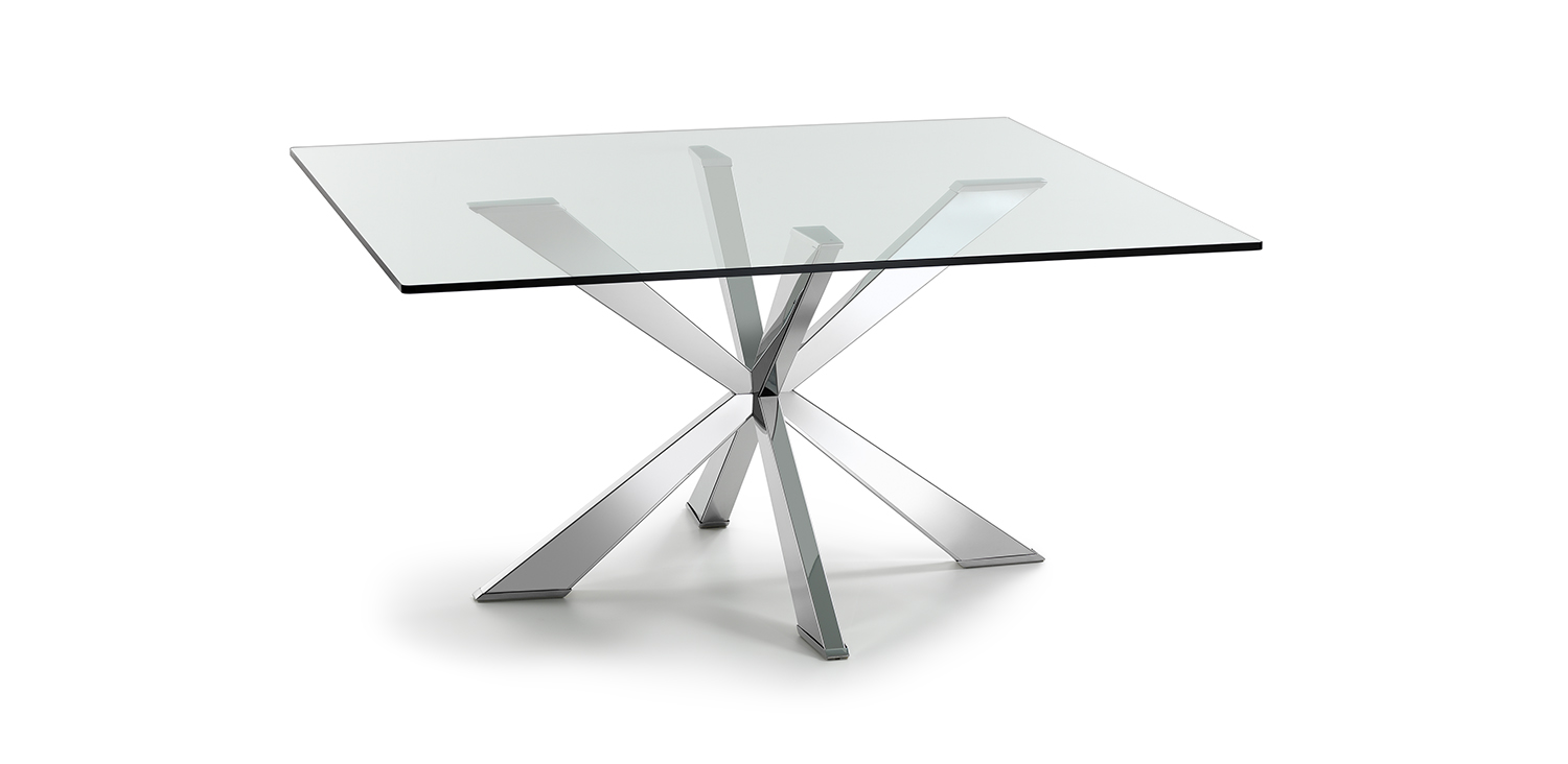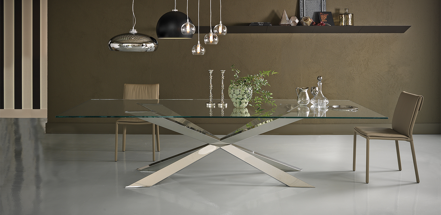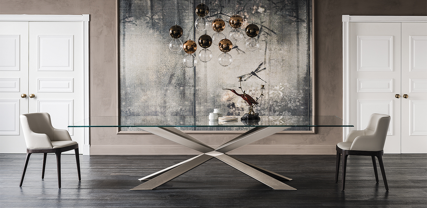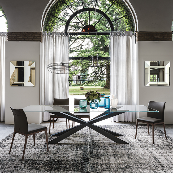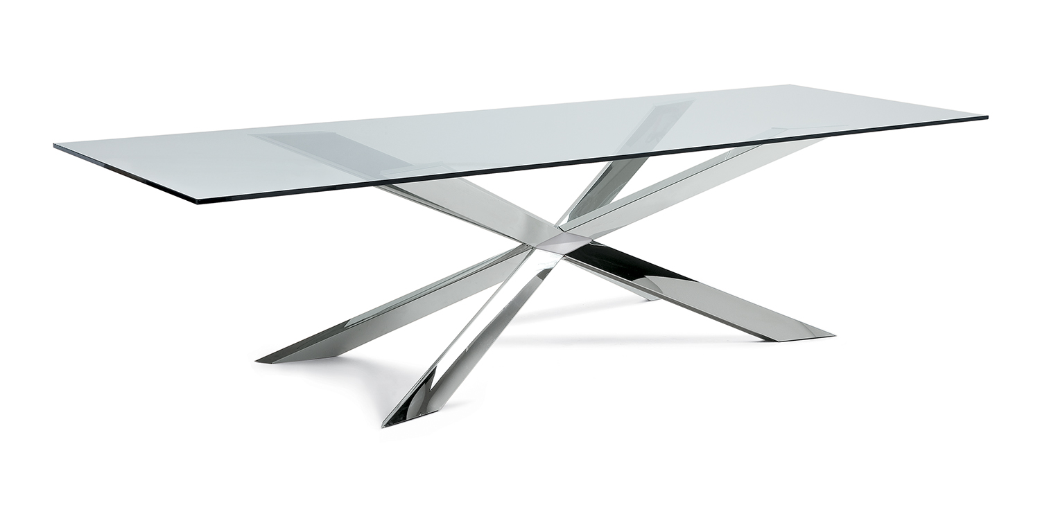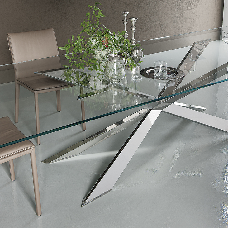 Table with base in matt black (OP17), graphite (OP69), white (OP71) painted steel, or in weathered brass or polished stainless steel, or in satin bronze (15), satin titanium (11) painted steel, or with wooden base in Canaletto walnut (NC), dark Wenghè (W2) or Heritage oak (HR). Top in 15mm clear, extra clear or extra clear glass with reversed bevelled edges, laid on the base. Glass top 12mm on 200x106 and 182x90 version. Small reflection irregularities on the stainless steel base or glazes on the satin titanium or satin bronze painted base are due to handmade processing.