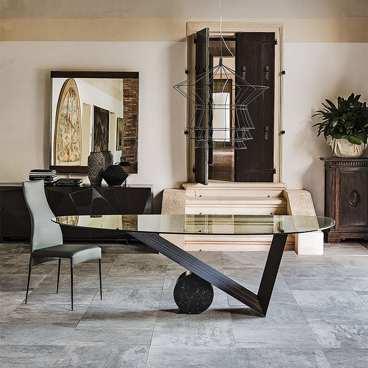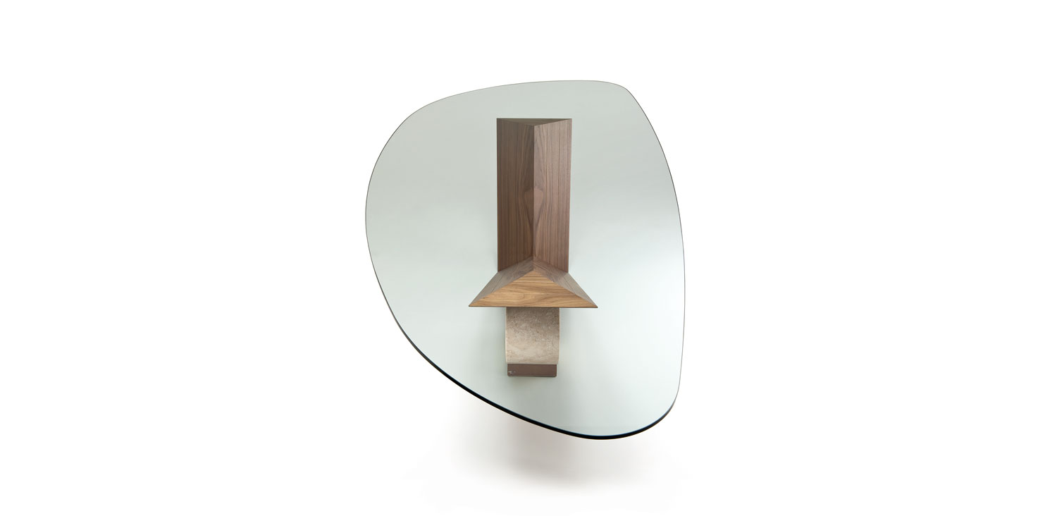 Table in Canaletto walnut (NC) or burned oak (RB) and cylinder in Travertine (TN), black Marquina (NM) or white Carrara (BC) marble. Top in 15mm clear glass, laid on the base. The shaped top 240x115 is 12mm thick.