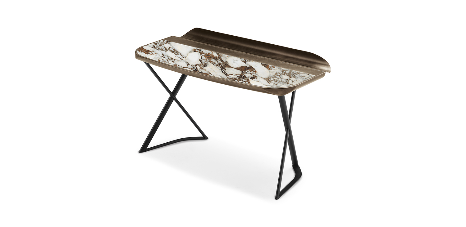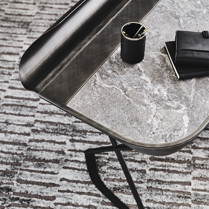 Desk with base in titanium (GFM11), bronze (GFM18) or black (GFM73) embossed lacquered steel. Top in ceramic Marmi Alabastro (KM02), Supreme (KM03), Ardesia (KM04), matt Golden Calacatta (KM05), glossy Golden Calacatta (KM06), matt Portoro (KM07), glossy Portoro (KM08), glossy Sahara Noir (KM09), Emperador (KM10), Makalu (KM11), Breccia (KM12), Arenal (KM13) or Zefiro (KZ20) with Brushed Bronze or Brushed Grey lacquered and rounded lower profile and grooved tray in Brushed Bronze or Brushed Grey lacquered steel.
