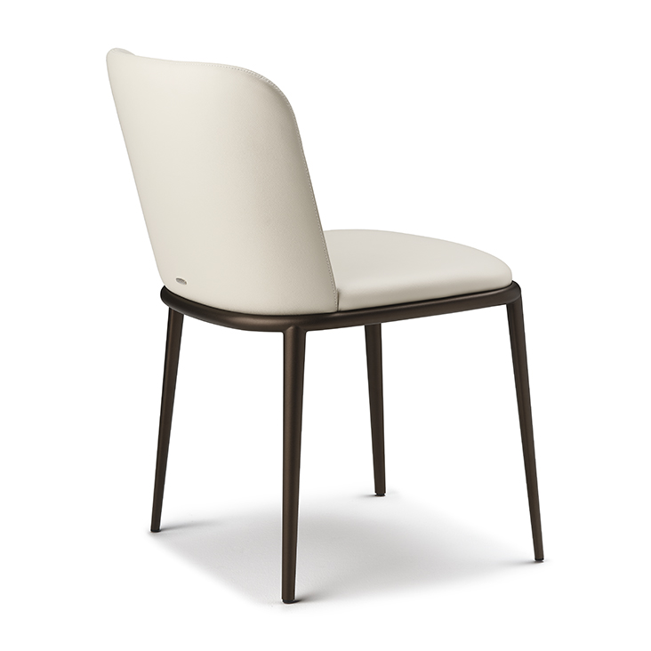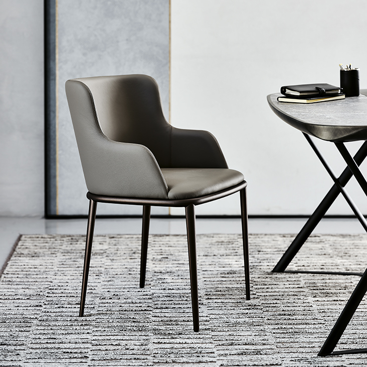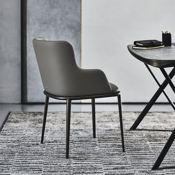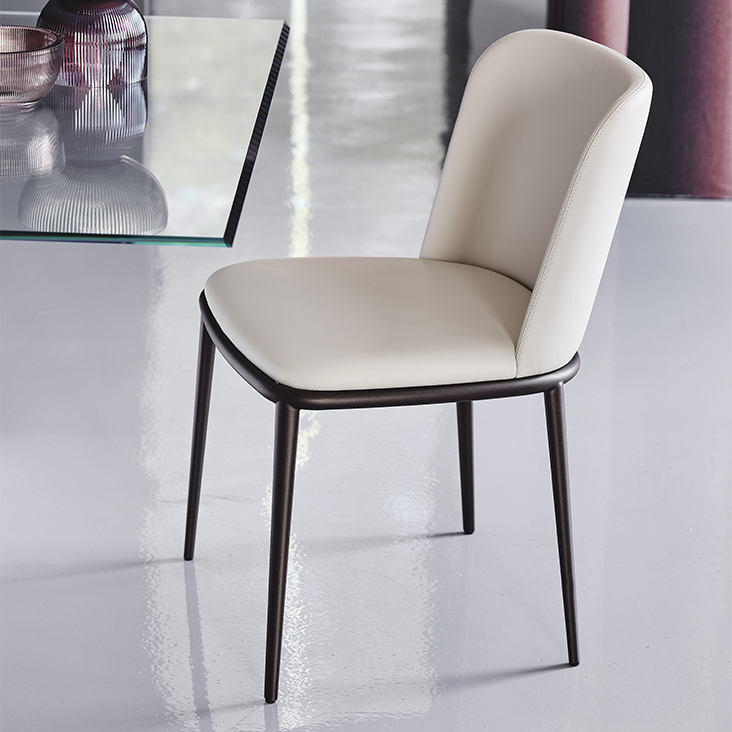 Chair with or without arms with frame in titanium (GFM11), bronze (GFM18), graphite (GFM69), white (GFM71) or black (GFM73) embossed lacquered steel. Cover in fabric, synthetic nubuck, micro nubuck, soft leather or synthetic leather as per sample card. The cover is not removable.