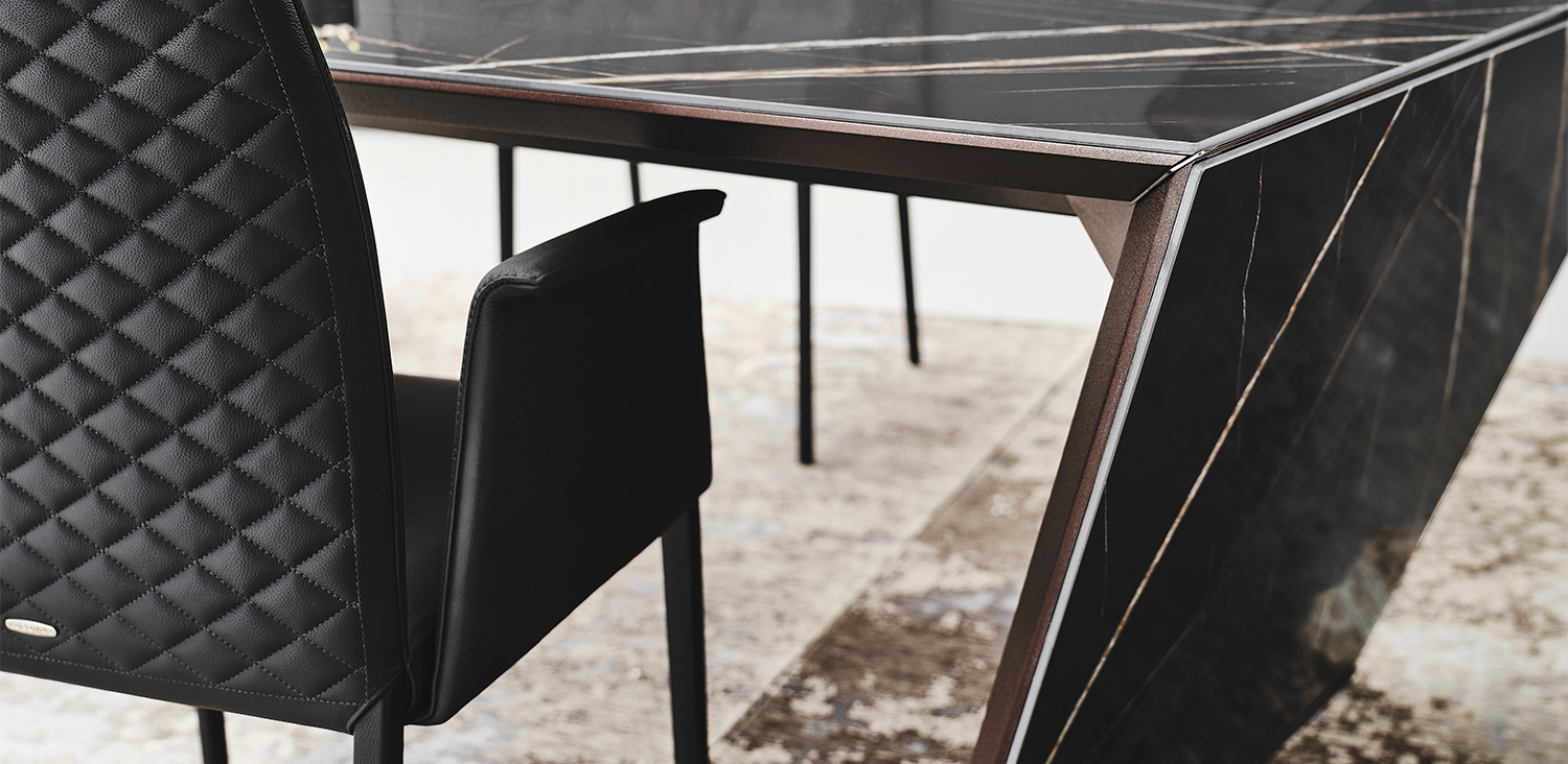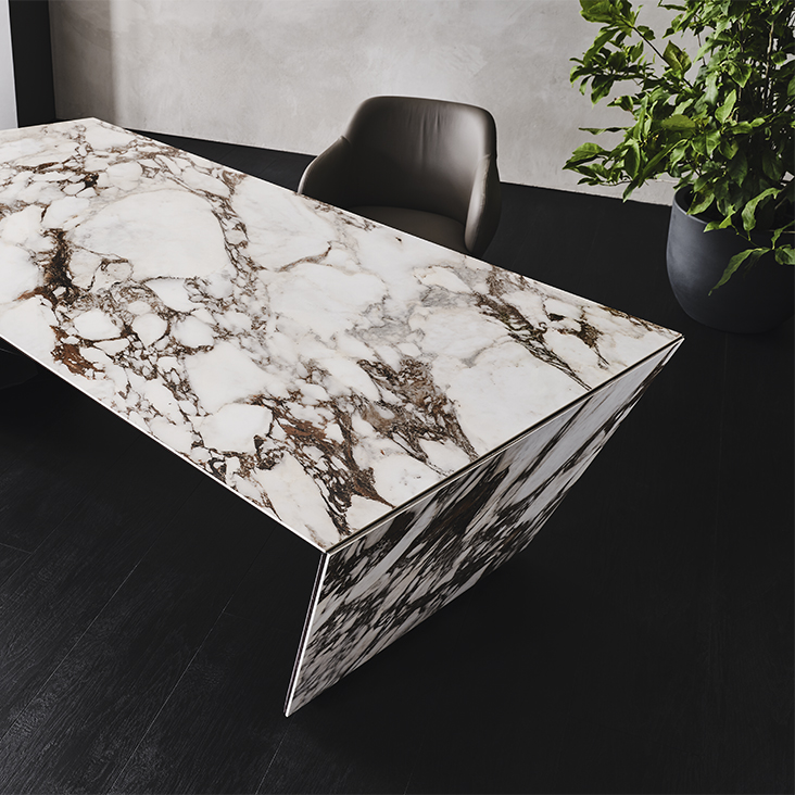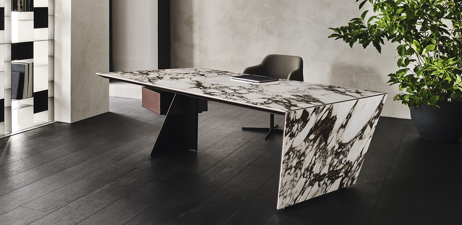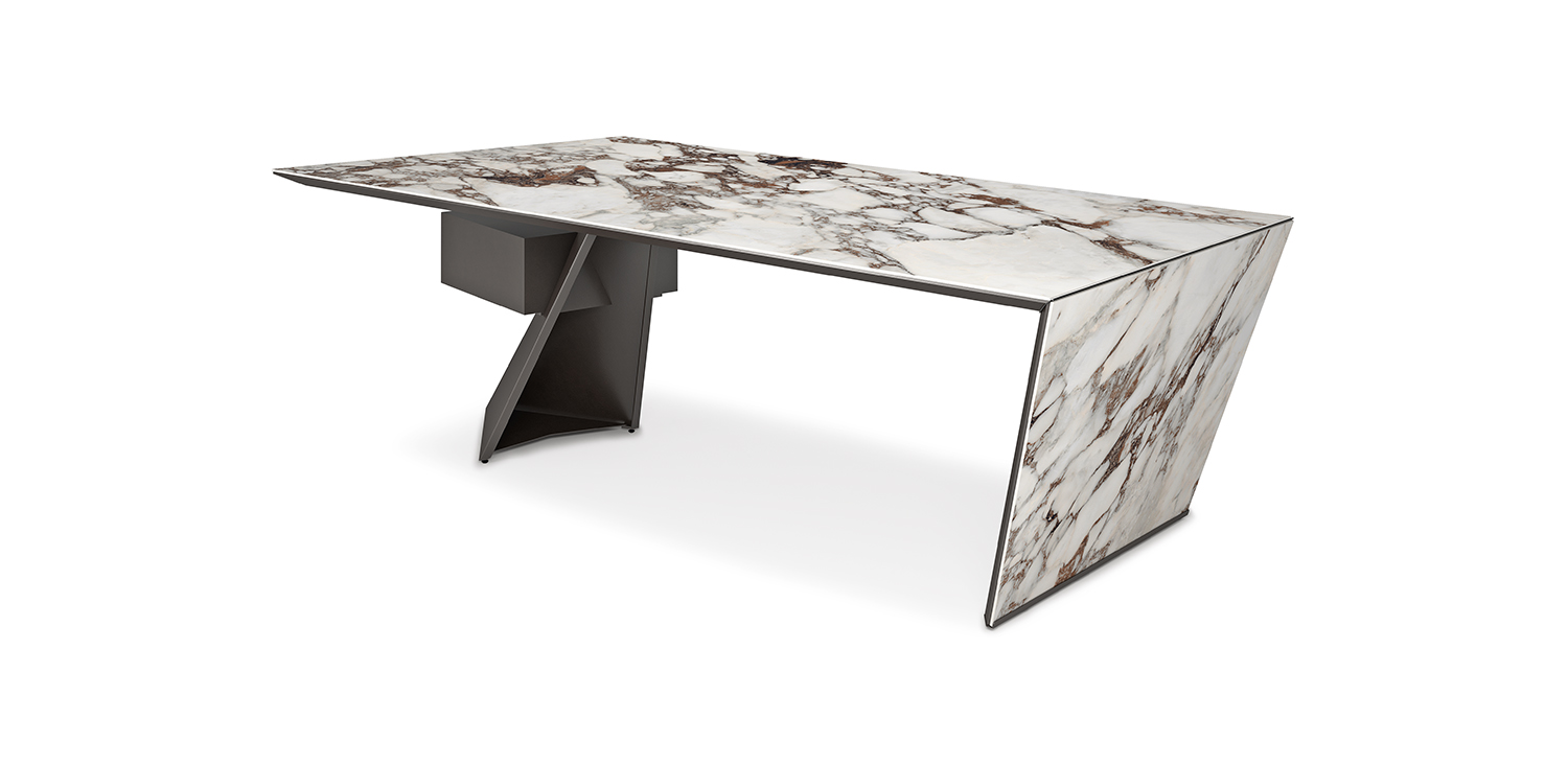 Desk in Marmi ceramic Alabastro (KM02), Supreme (KM03), Ardesia (KM04), matt Golden Calacatta (KM05), glossy Golden Calacatta (KM06), matt Portoro (KM07), glossy Portoro (KM08), glossy Sahara Noir (KM09), Emperador (KM10), Makalu (KM11), Breccia (KM12) or Arenal (KM13) with insert in black chrome (06). Leg in graphite (GFM69), titanium (GFM11) or bronze (GFM18) embossed lacquered steel, structure and drawer unit embossed lacquered wood matching the color of the leg.