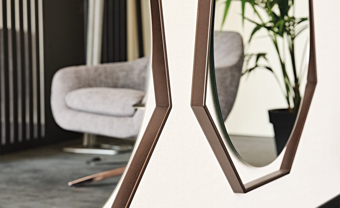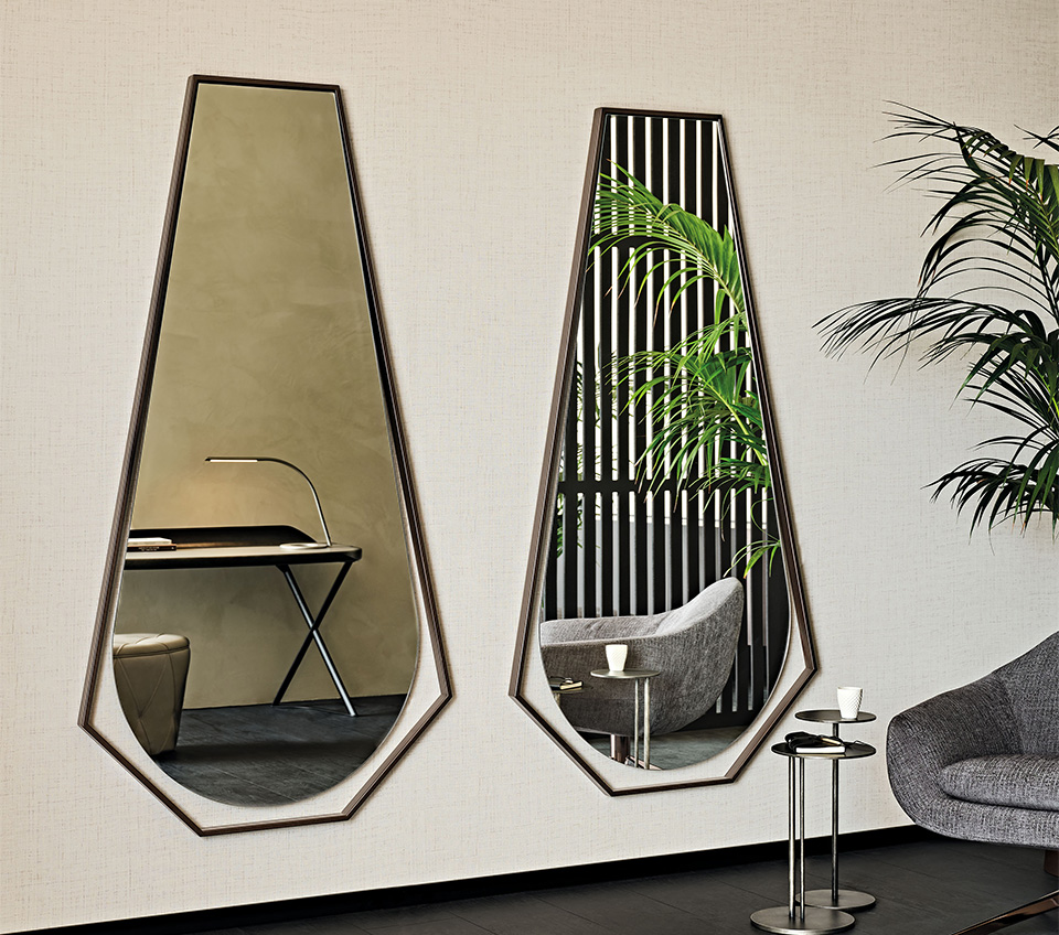 The Sautern modern mirror has an iconographic silhouette defined to appear as a logo or crest in the centre of a wall with a pop style. The gentle lower curve is framed by an angular steel geometry, with the distance between the two elements emphasising the contrast between materials and shapes. The rear wall that can be glimpsed in the empty space thus created becomes an integral part of this design mirror. The mirrored surface resembles a drop suspended in mid-air, joined to the frame only on the upper side.