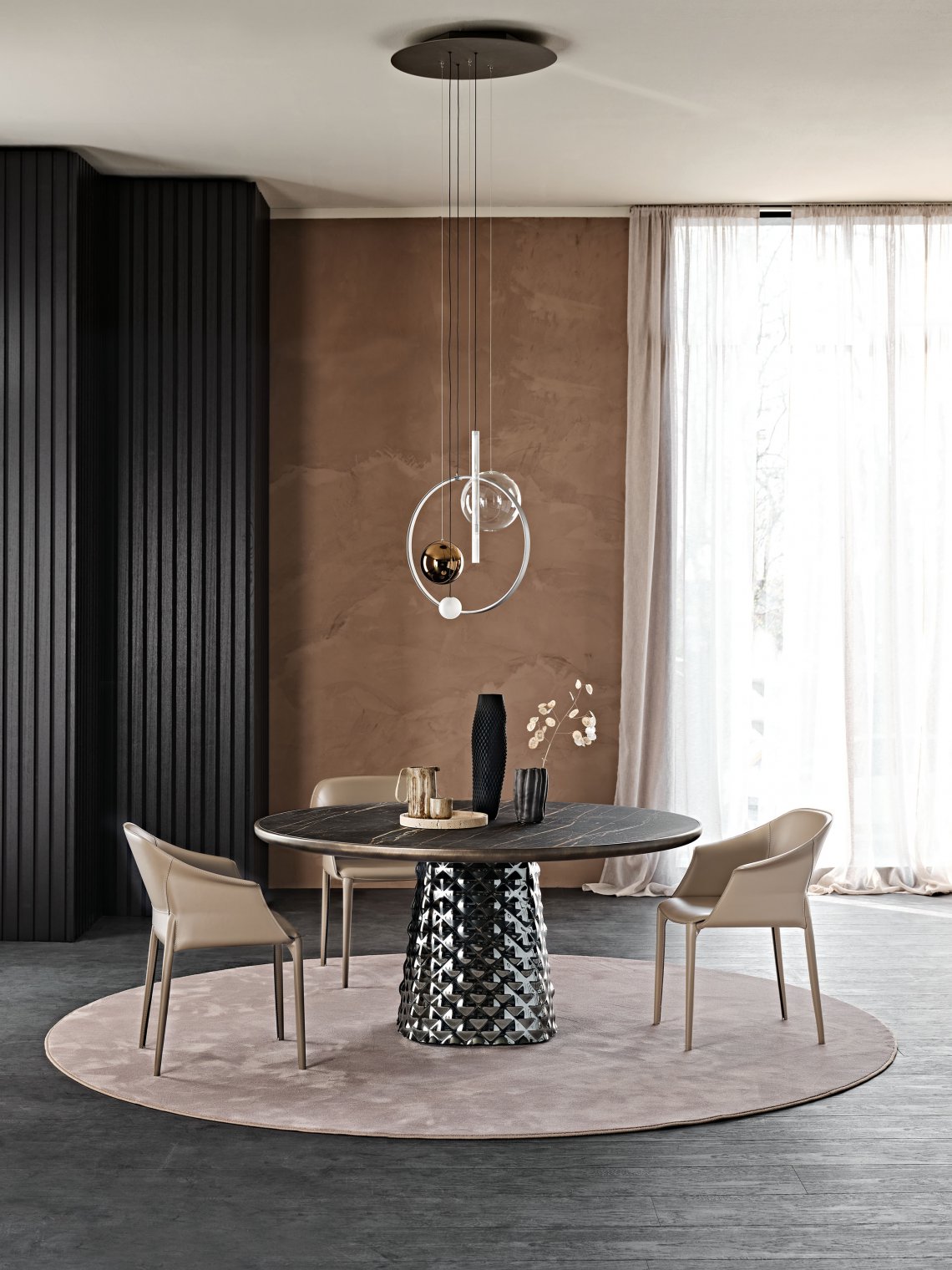 The central base consists of two finely worked plates of couture mirrored glass. The table creates a play of soft reflections, in which the surrounding objects and light sources reverberate. The glass is shaped with an unprecedented technique that gives the surface a three-dimensional effect like quilting on fabric. The table tops of the Atrium line range from wood to ceramics up to round tables in wood and ceramics combined.