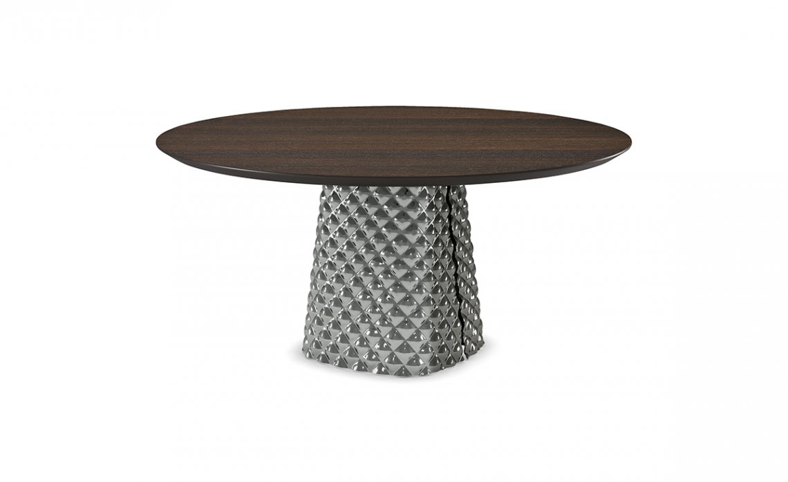 The central base consists of two finely worked plates of couture mirrored glass. The table creates a play of soft reflections, in which the surrounding objects and light sources reverberate. The glass is shaped with an unprecedented technique that gives the surface a three-dimensional effect like quilting on fabric. The table tops of the Atrium line range from wood to ceramics up to round tables in wood and ceramics combined.