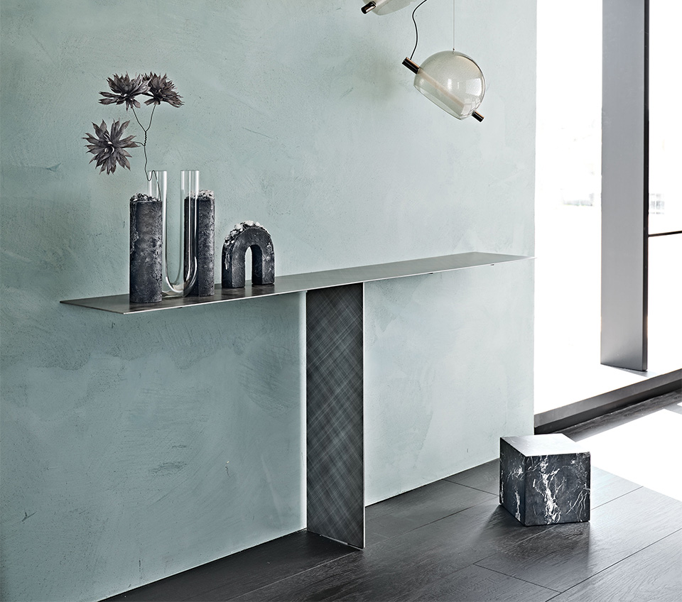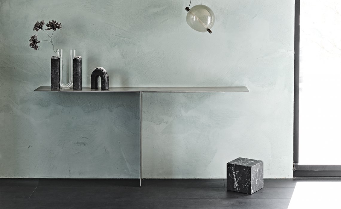The Tee console is an example of conceptual and structural minimalism. Two metal sheets are the only elements of this modern hallway console. The thinness is achieved thanks to precision manufacturing techniques, while the corners are clearly rounded with care. Both the base and top are finished with the sophisticated Brushed finish, consisting of a special freehand brushing technique. Light scratches, imperceptible to the touch, create a warp and weft metallic decoration.