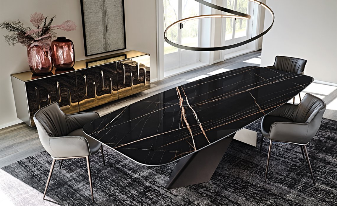 For those devoted to conviviality, even in limited spaces, there are two extendable Drive versions available: one for the refined glass top, with decorative CrystalArt print in different colours, and the other for the Marmi Ceramic top, in several exclusive shades, to make each environment remarkable. The collection is completed by the Signature model, hand-decorated by an artisan collective. Each table is unique and irreplicable, just like a work of art.