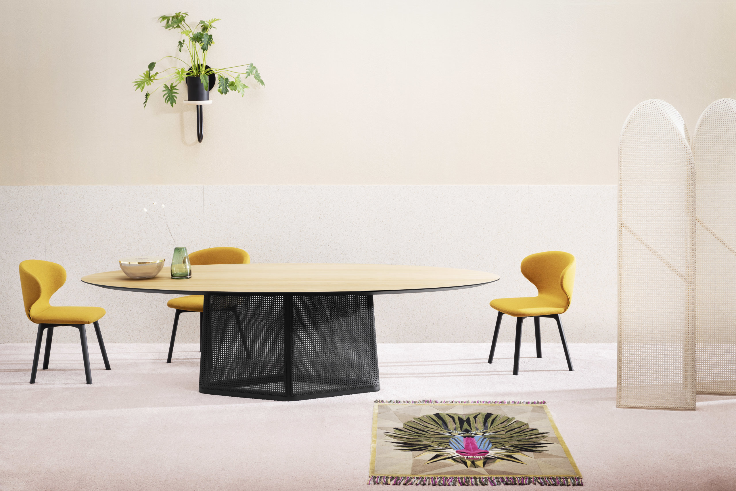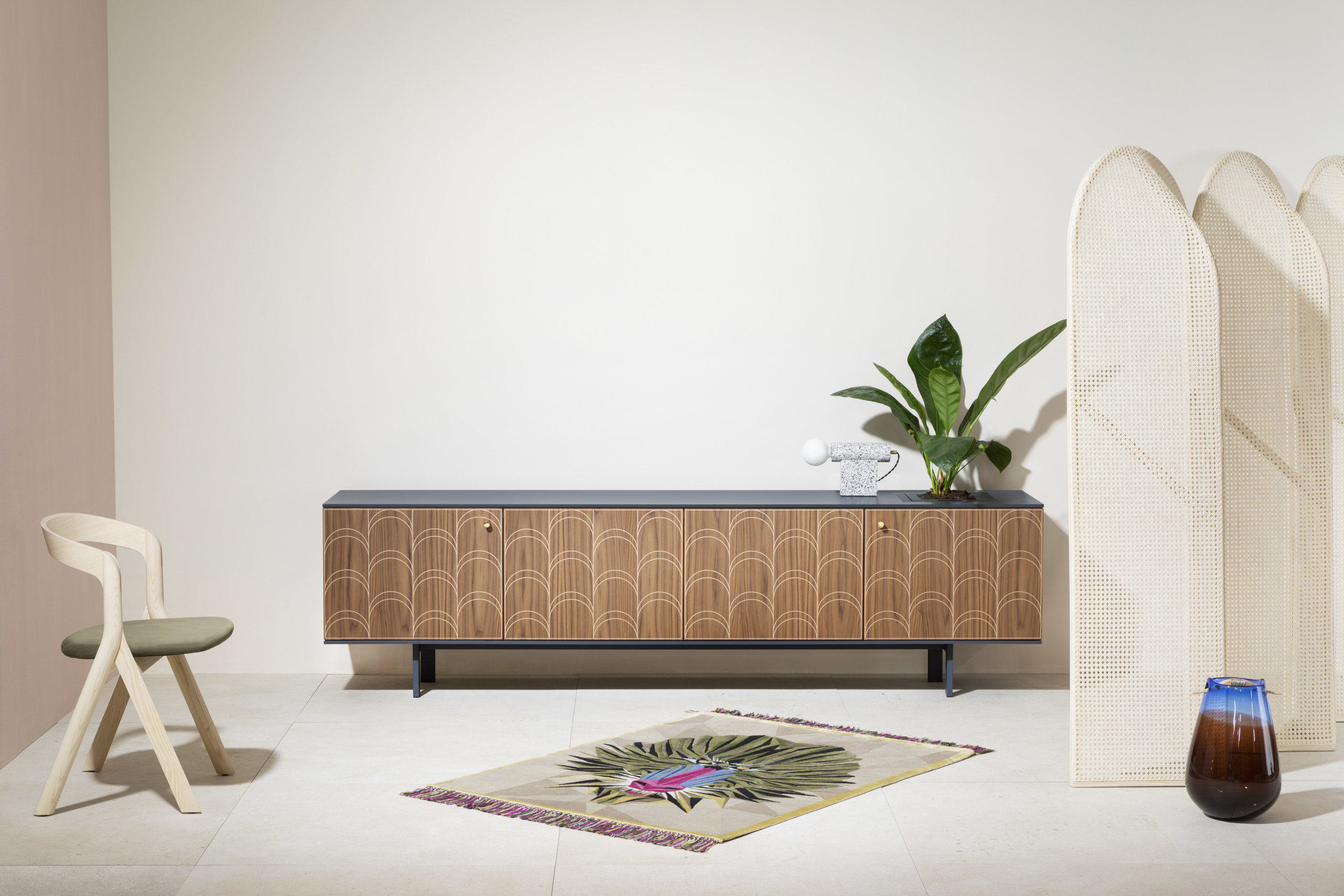 At the same time it was very important to stay connected to the tradition of rug manufacturing techniques, I felt that going back to the concept of the tapestry (arazzo) which was used in the past to tell stories and legends of families and religions was the best way to stay connected to tradition in a contemporary way, like if this collection was supposed to be hanged in a palace salon during a dancing evening. The fringe is a must have that completes the balance between colors and natural elements. "