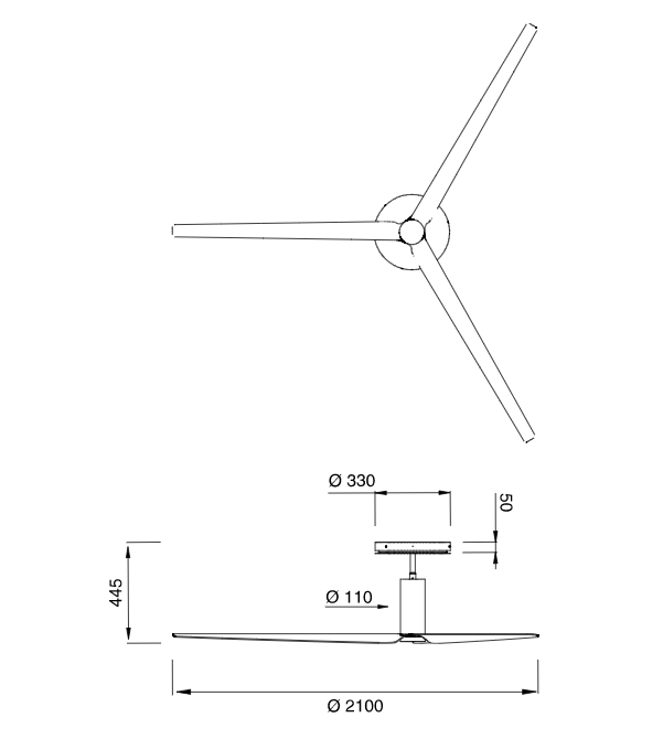 Ceiling fan (? 2100 mm) in AISI 316L stainless steel, with wood and carbon fiber blades, natural wood essence or lacquered. Integrated LED lighting, remote control included. Product suitable for indoor installation