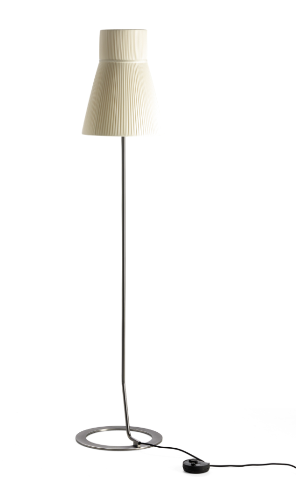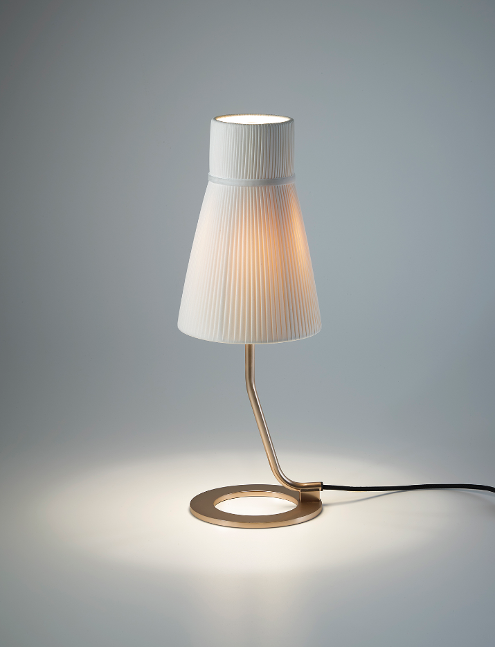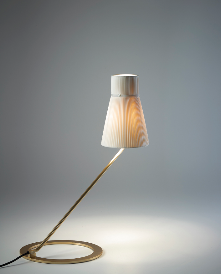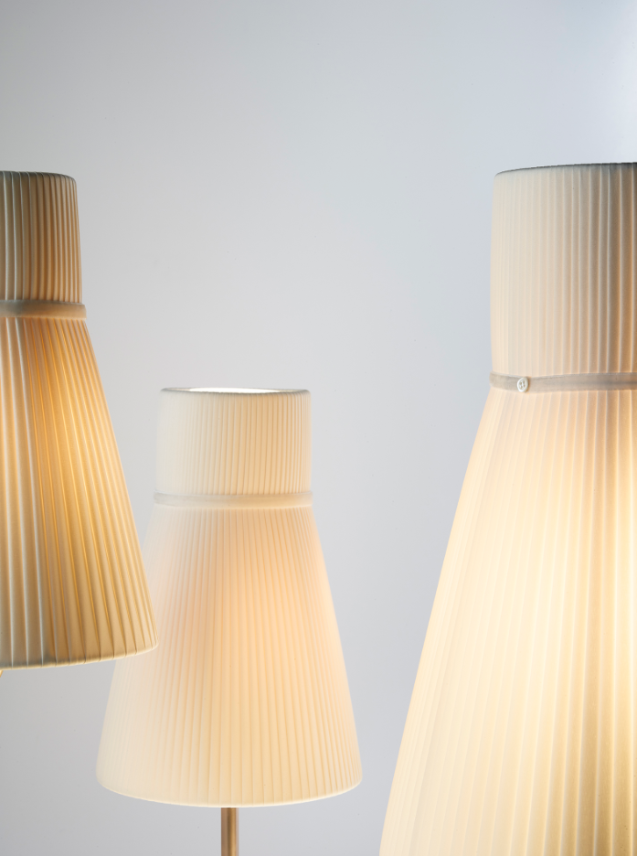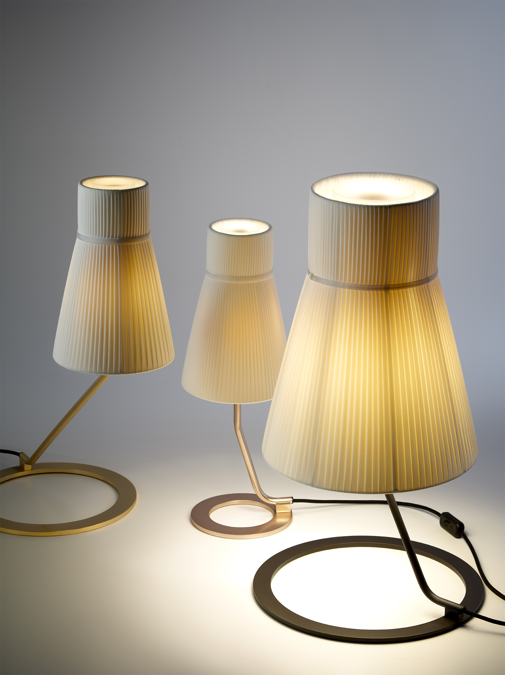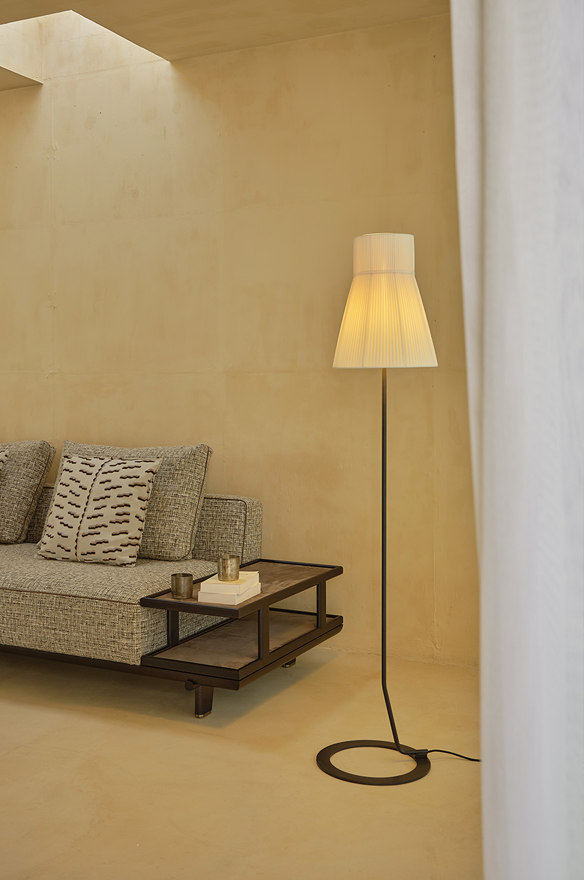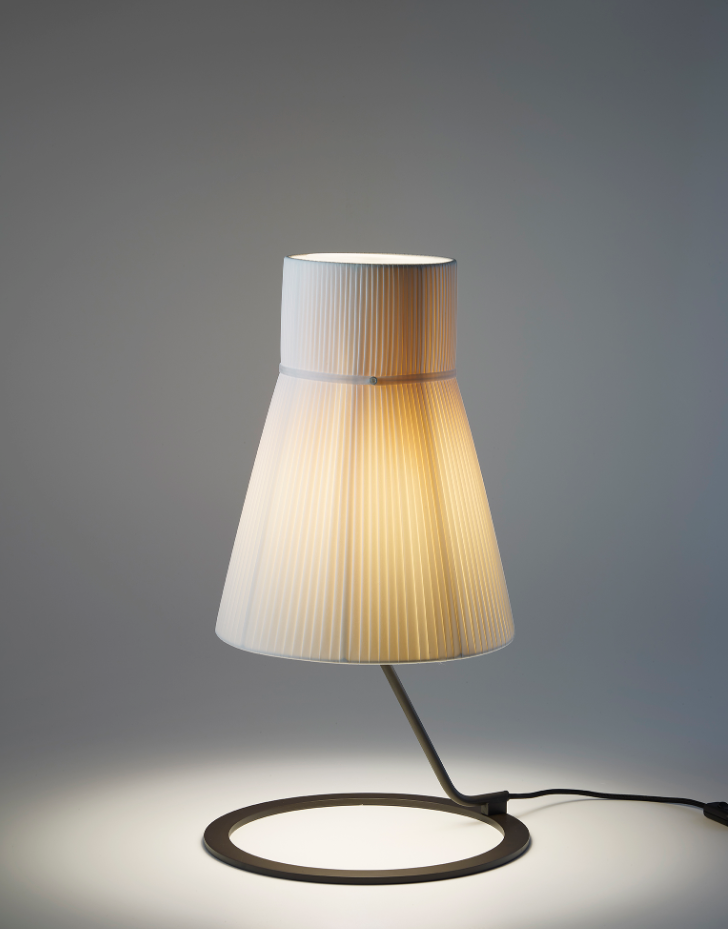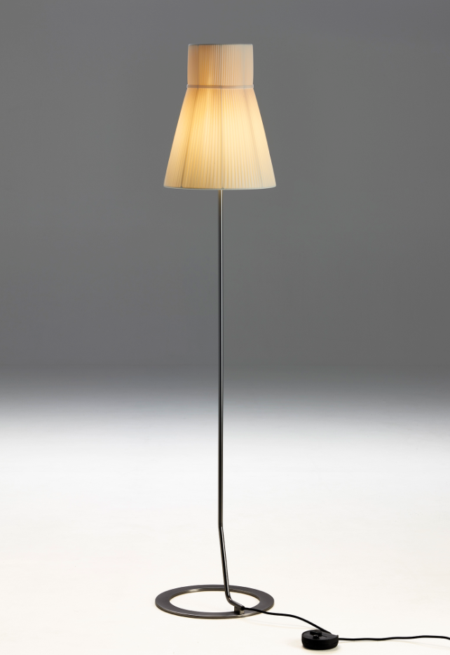 Audrey è una collezione di lampade da comodino, scrivania, tavolo e terra. La struttura, semplice e lineare, presenta uno stelo in metallo sul quale poggia il paralume in tessuto plissettato e cristallo bianco sabbiato la cui forma particolare ricorda quella del cappello utilizzato dell’attrice britannica Audrey Hepburn. Il nastro del paralume è in velluto tono su tono e presenta un bottone in madreperla.