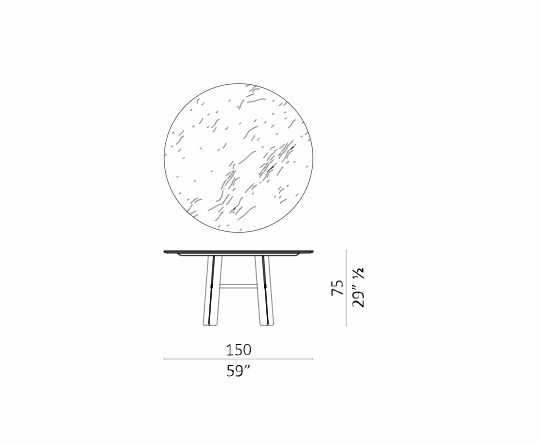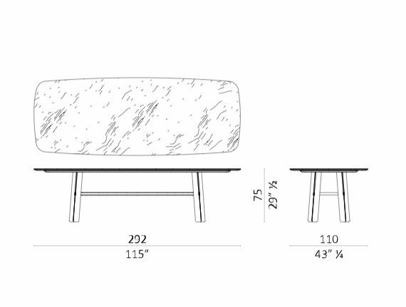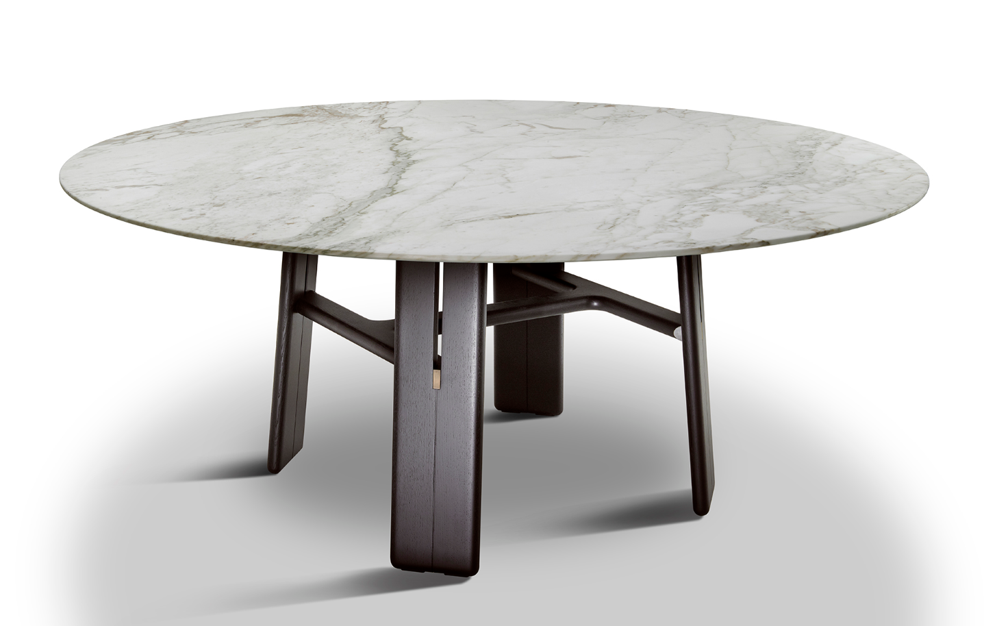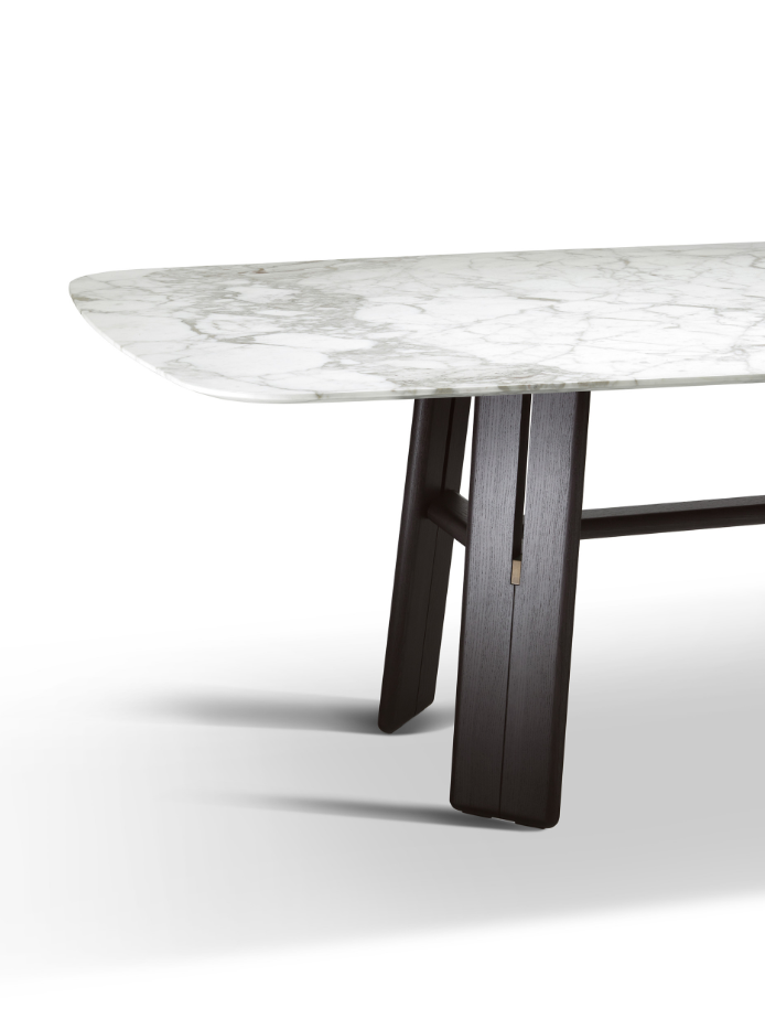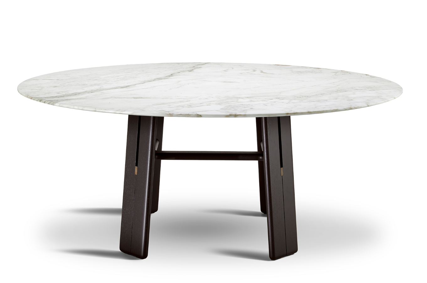 Il solido basamento in legno massello di frassino tinto Wengé o Moka, recupera e rielabora lo stile e il disegno dei tavolini DUO senza esserne l’esatta trasposizione. Infatti, le gambe sono composte da grandi tavole a sezione rotonda inclinata e collegate tra loro da una crociata con elementi in ottone bronzato. Il basamento sorregge il top di forma rettangolare o circolare in marmo Calacatta. DUO Table è il primo esempio a catalogo per Ceccotti Collezioni di un tavolo con piano in marmo mono-lastra libero senza cornice in legno.
