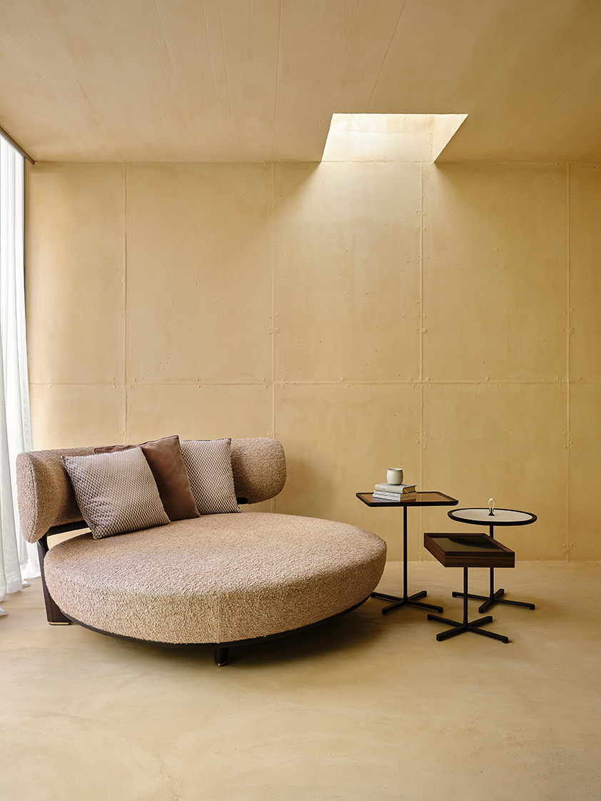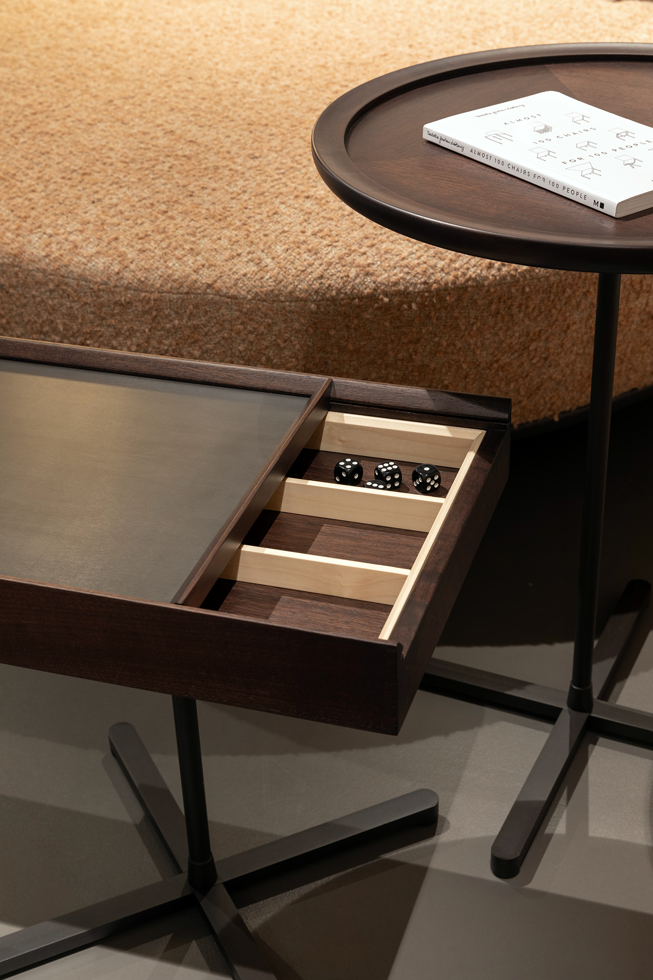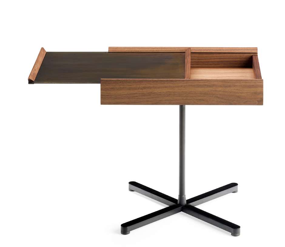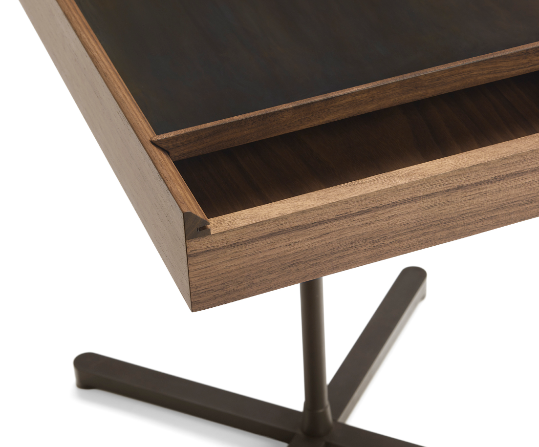 I nuovi tavolini Galimede disegnati da Giuseppe Casarosa interpretano le moderne esigenze abitative coniugando l’eleganza e la maestria artigiana di Ceccotti Collezioni con la necessità di organizzare e ottimizzare gli spazi in modo sempre più flessibile e dinamico. Galimede cassetto presenta un vano portaoggetti realizzato in noce americano accessibile mediante lo scorrimento del piano rettangolare in ottone brunito che funge da superficie d’appoggio. La struttura è in acciaio bronzato disponibile in due altezze.