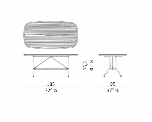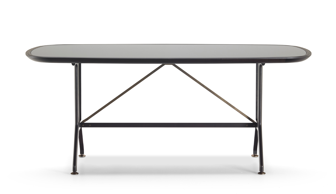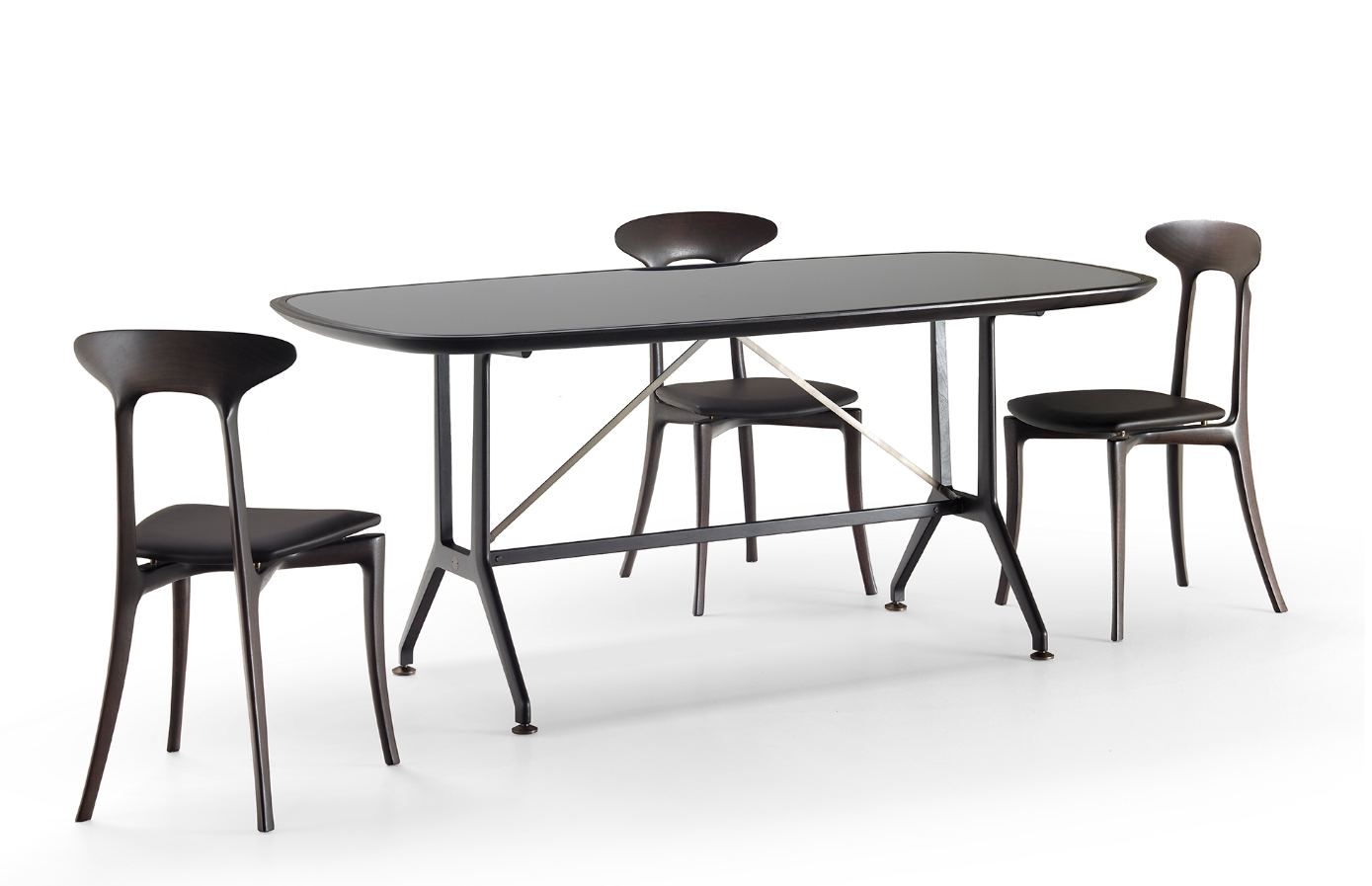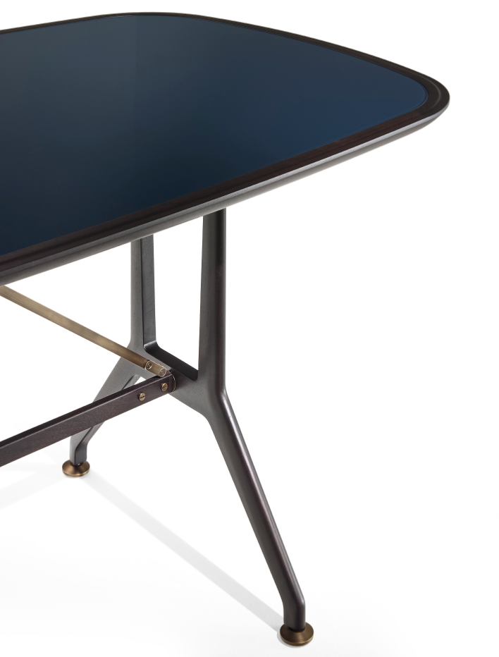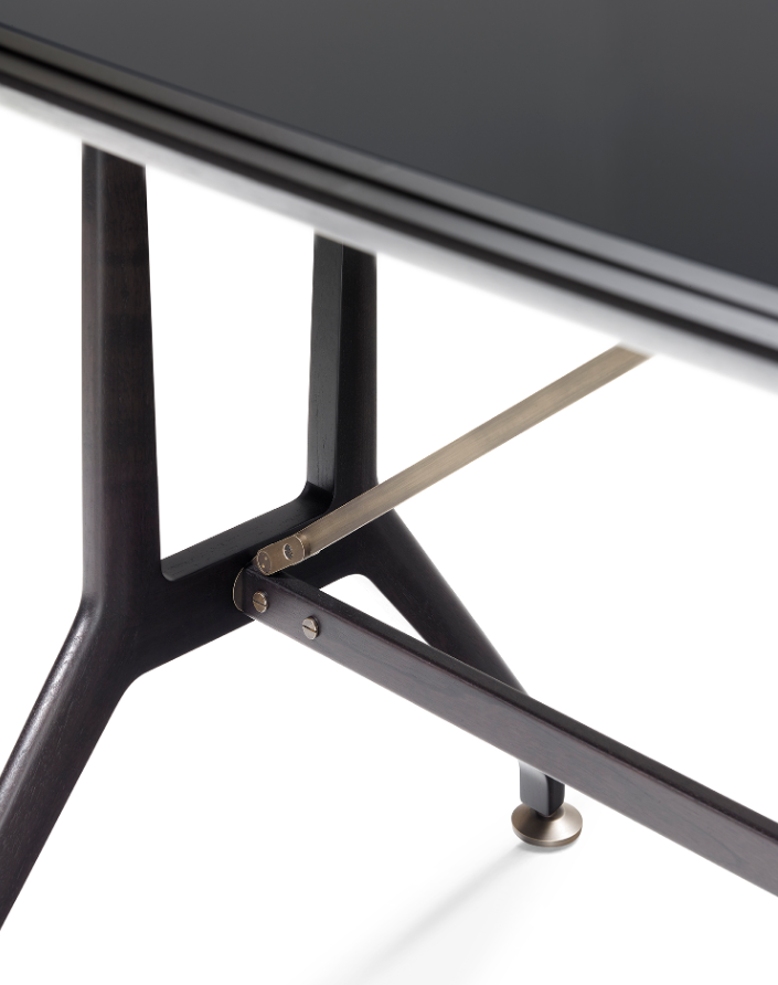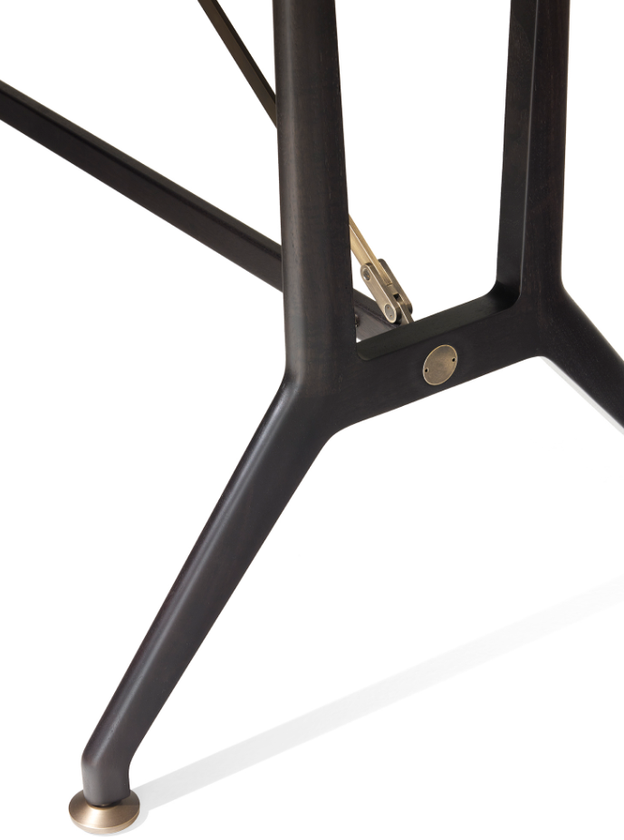 La struttura è caratterizzata da due cavalletti in legno massello attraversati da due tiranti tenditori in ottone posti in diagonale che ricordano le forme del “Sopwith Camel”, uno dei più importanti aerei da caccia biplano del Regno Unito attivi durante la Prima guerra mondiale. Il piano è in legno, vetro retro verniciato o pelle.