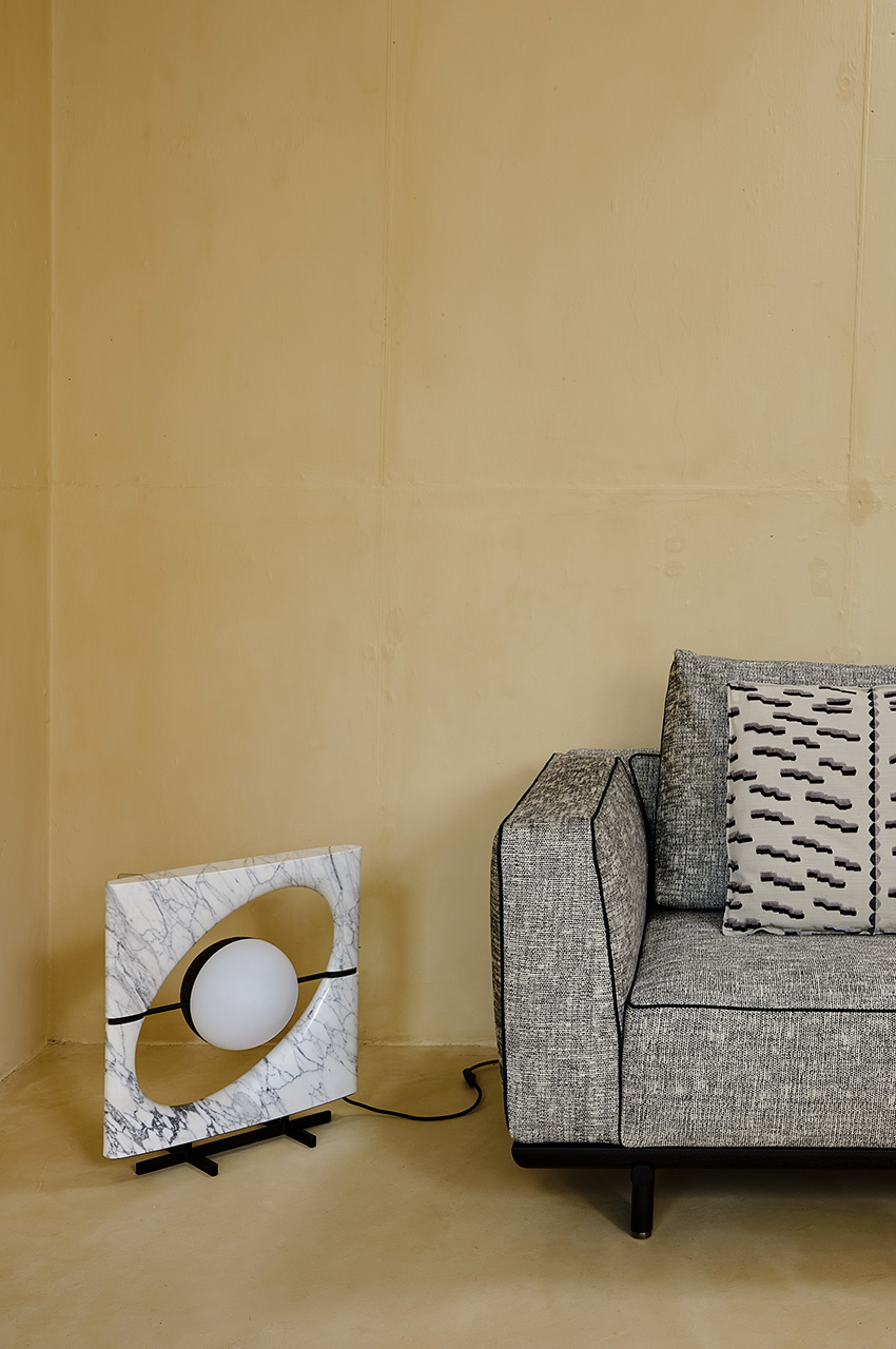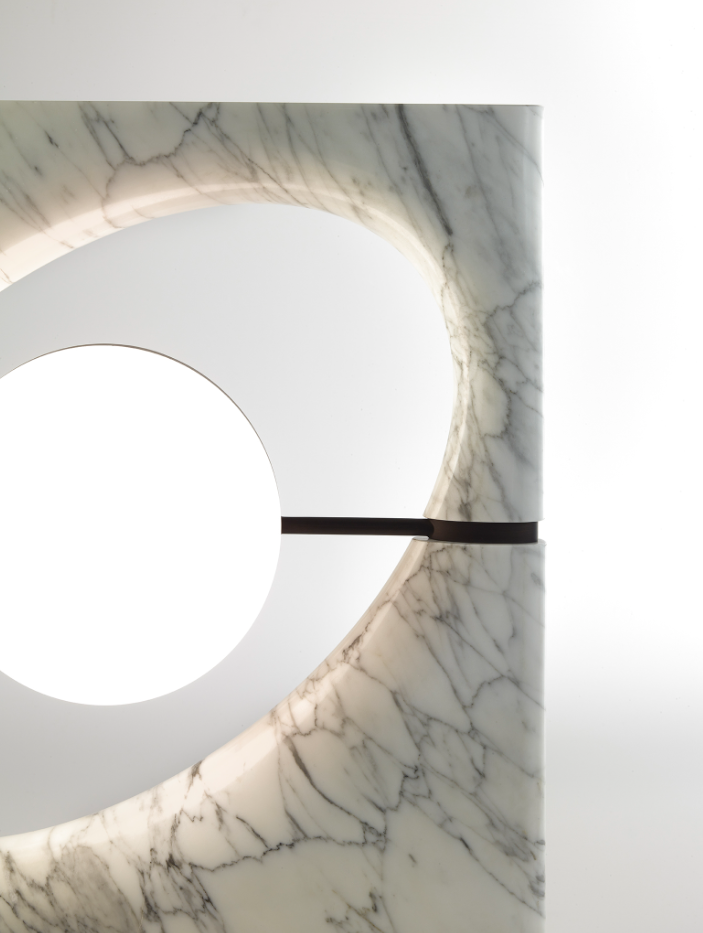 La lampada è composta da un corpo luminoso di forma sferica che sembra essere sospeso all’interno di uno spazio ellittico, proprio come Saturno mentre gravita nel suo sistema di anelli. Il paralume è formato da due semisfere: una in vetro sabbiato bianco che funge da fonte luminosa diffusa e una in metallo forato che proietta fasci di luce direzionali. Il corpo della lampada è composto da una cornice scolpita a partire da un blocco unico di pietra, accuratamente selezionato per esaltarne le venature naturali, disponibile in marmo Cervaiole. La lampada è sorretta da un piedistallo in metallo.