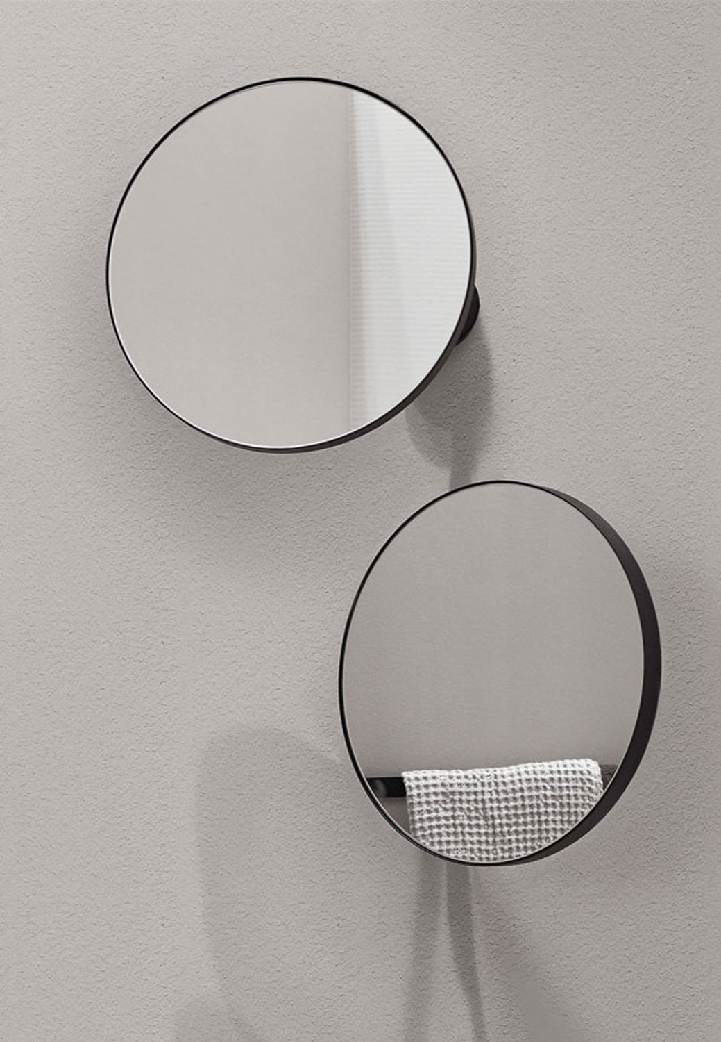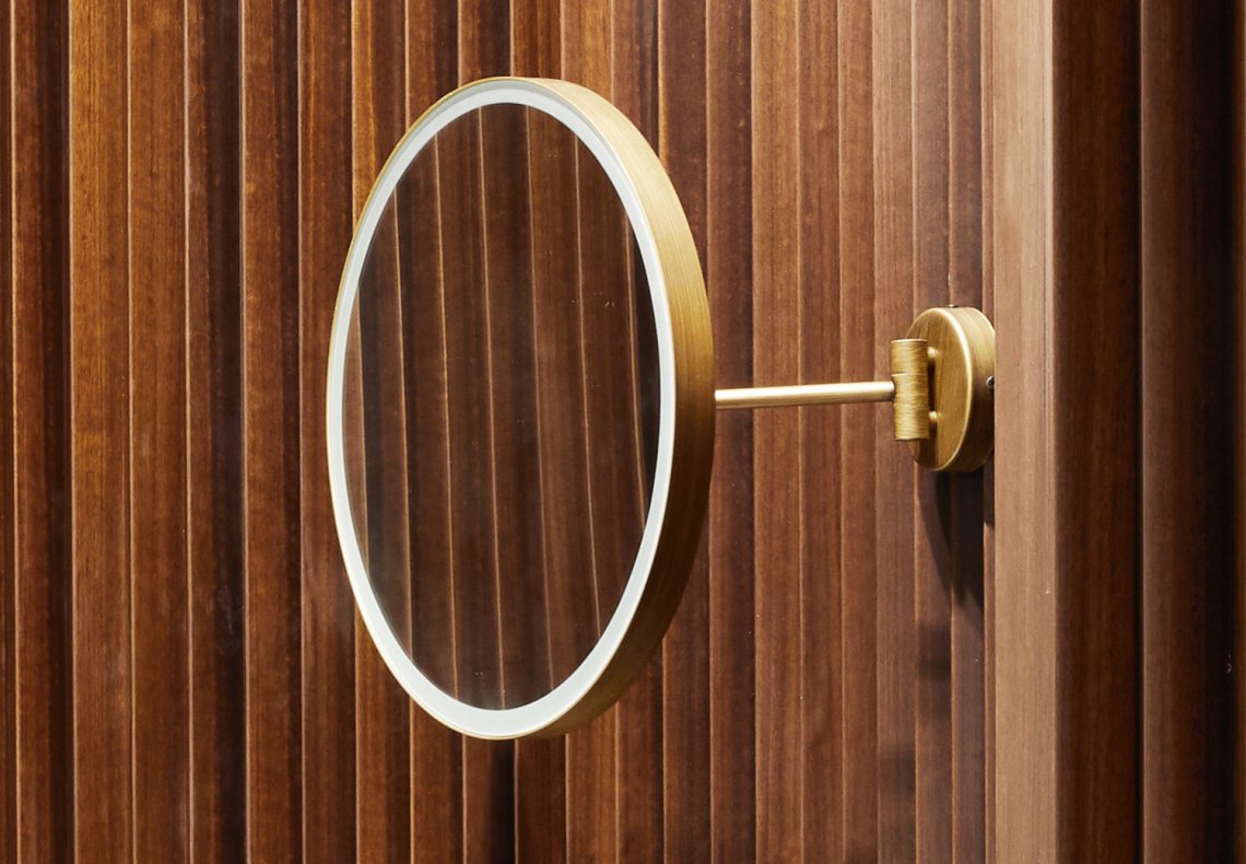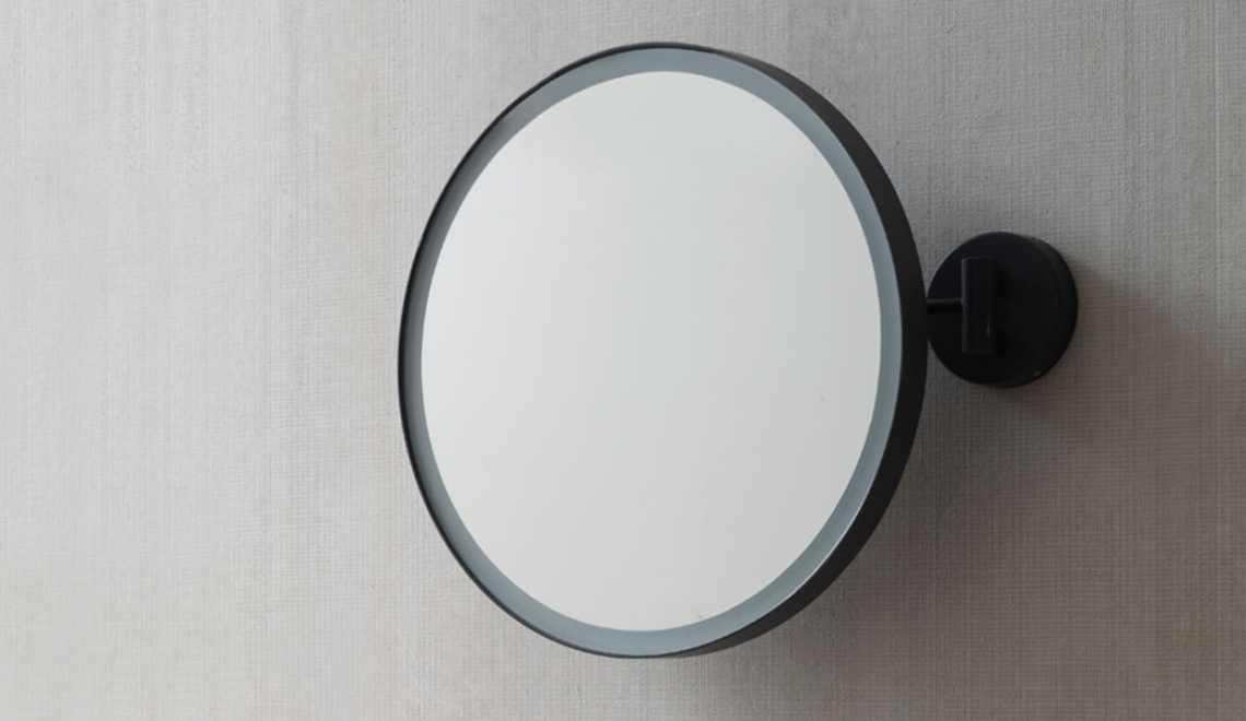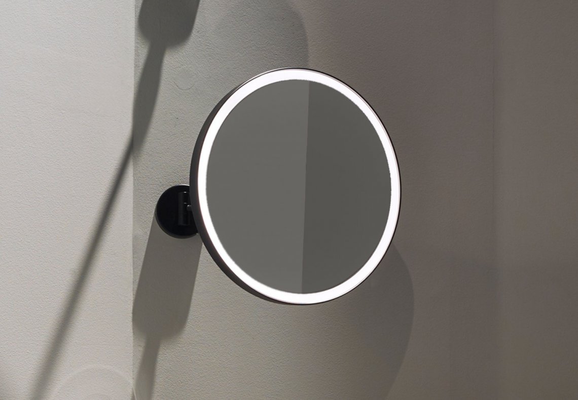 一款舒適的圓形鏡子,有多種不同的飾面,可提供不帶燈或帶禮貌 LED 燈和光學開關的版本。