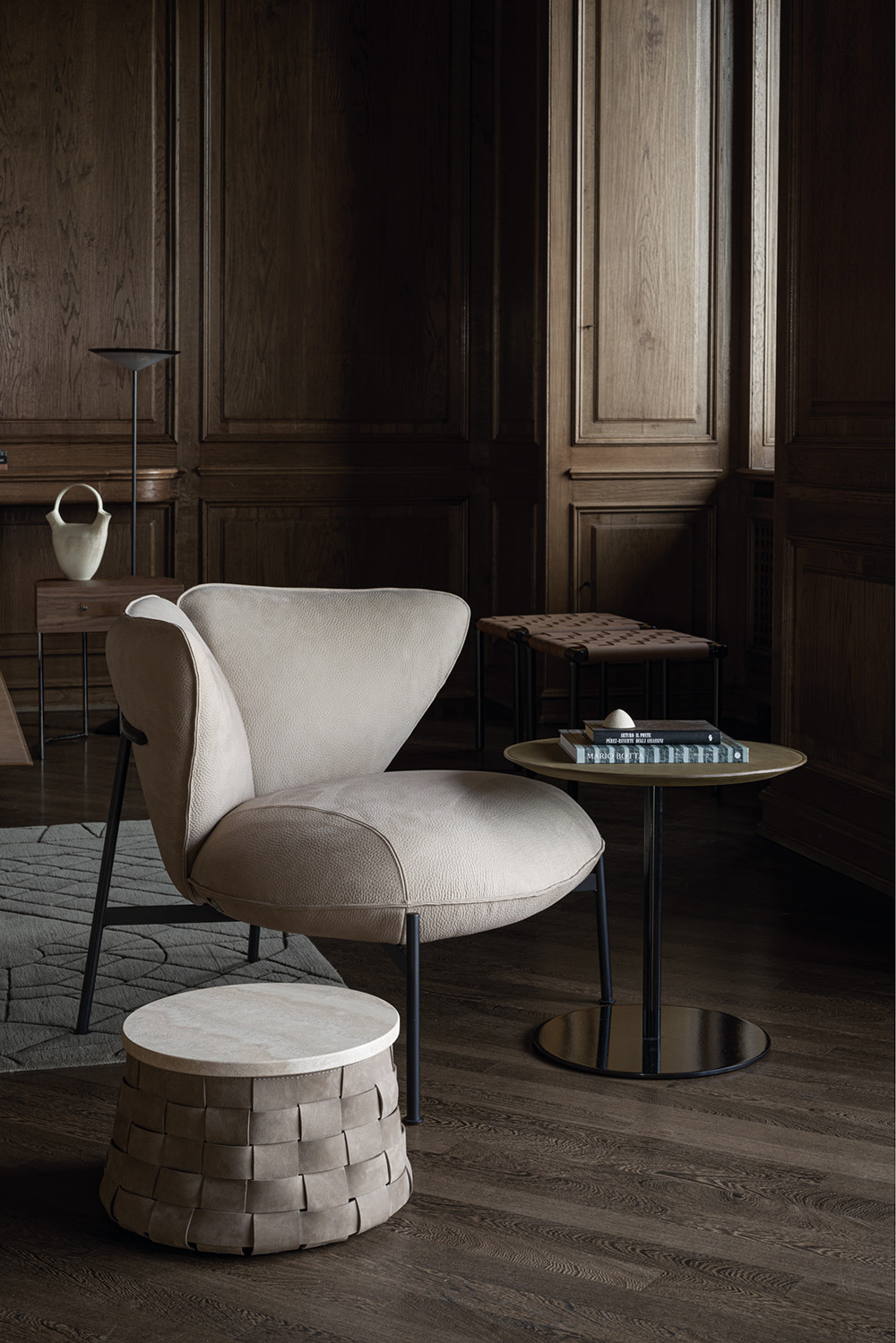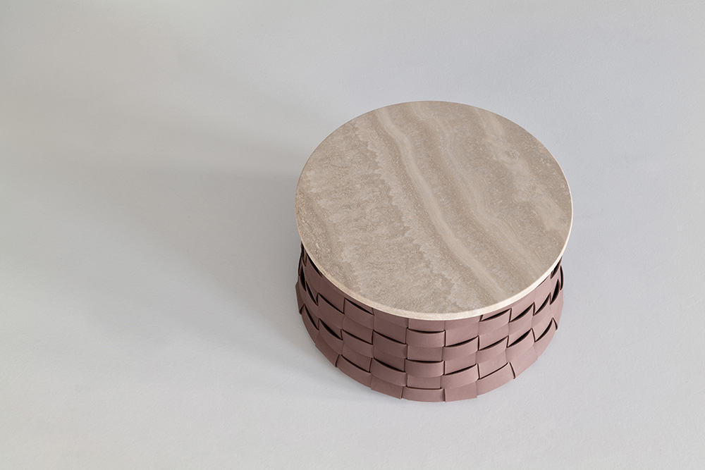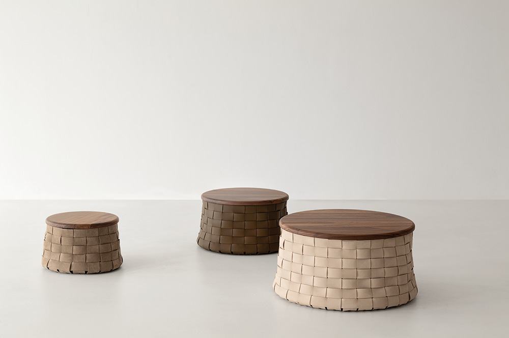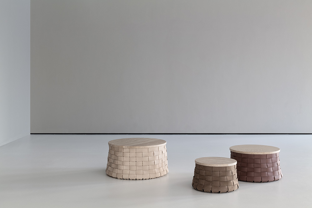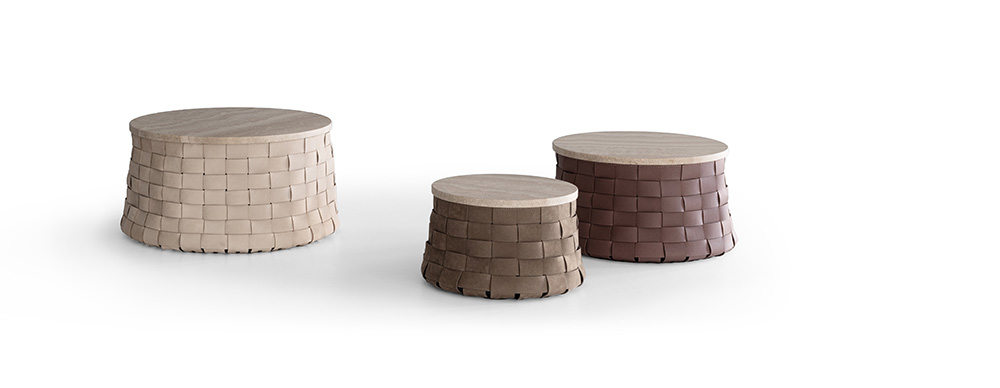 Dama coffee tables with removable container top in two finishes: Travertine stone and solid Canaletto walnut wood. The wooden base is painted black. The support metal structure is painted black, the external structure is made of woven leather with special raw cut edges finishing available in three different leathers: Soffio, Setanil and Natural Velour. If no preference is specified, the edges feature tone-on-tone lacquering. Dama tavolini con top removibile per contenitore in due finiture: Travertino e legno massello Noce Canaletto. Base in legno verniciata nera. Struttura di sostegno in metallo verniciato nero, struttura esterna in pelle intrecciata finitura cuoio disponibile in tre tipologie di pelle: Soffio, Setanil e Natural Velour.