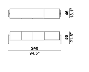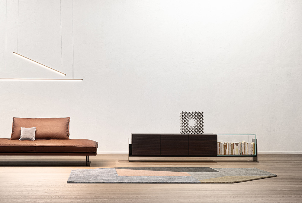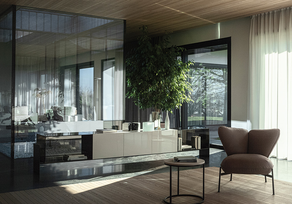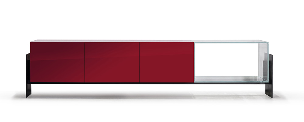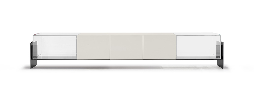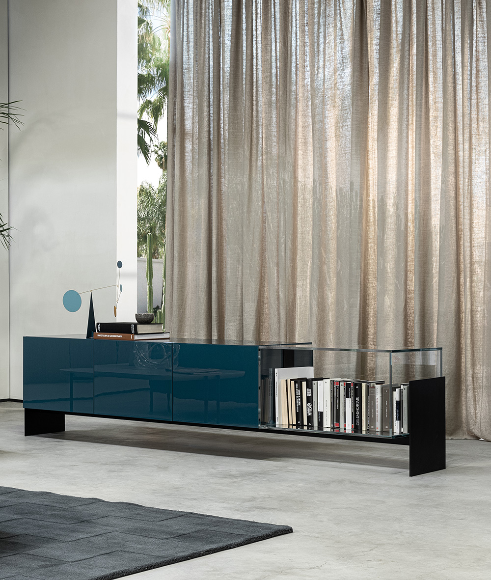 Wooden structure in multi-laminated wood with different finishes: veneered black ash wood or light Lati wood, gloss lacquered or matte lacquered available in different RAL colors: 9005, 3007, 6008 and 9002. Storage unit in glass: 5 closed sides with extra clear or bronze tinted toughened glass, 12 mm thick. Black painted metal base. Struttura in legno multi laminato disponibile con diverse finiture: impiallacciato in legno frassino nero o legno Lati chiaro oppure laccato lucido o opaco nei seguenti colori RAL: 9005, 3007, 6008 e 9002. Struttura in vetro: bussolotto chiuso su 5 lati in vetro extra chiaro temperato o bronzo, spessore 12 mm. Base in metallo verniciato nero.