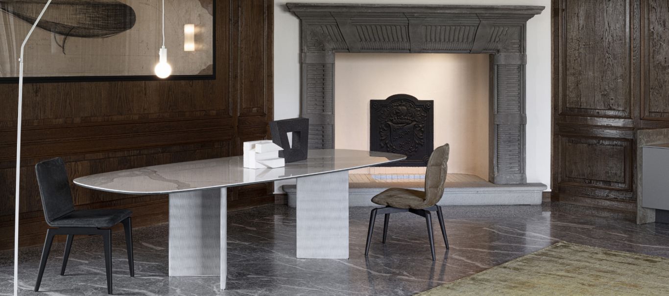 Glamour e chic. La forza del tavolo Wings è nelle due basi rivestite in pelle, ma l’eleganza è nel suo piano in effetto marmo.
