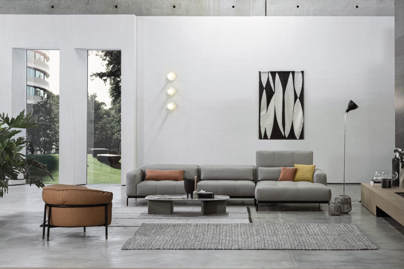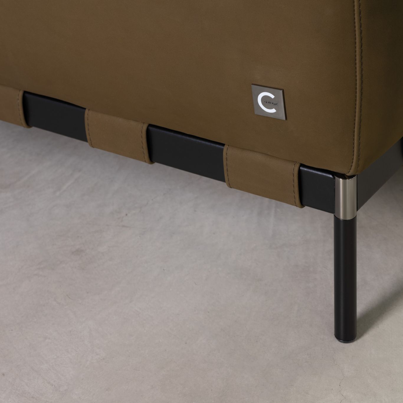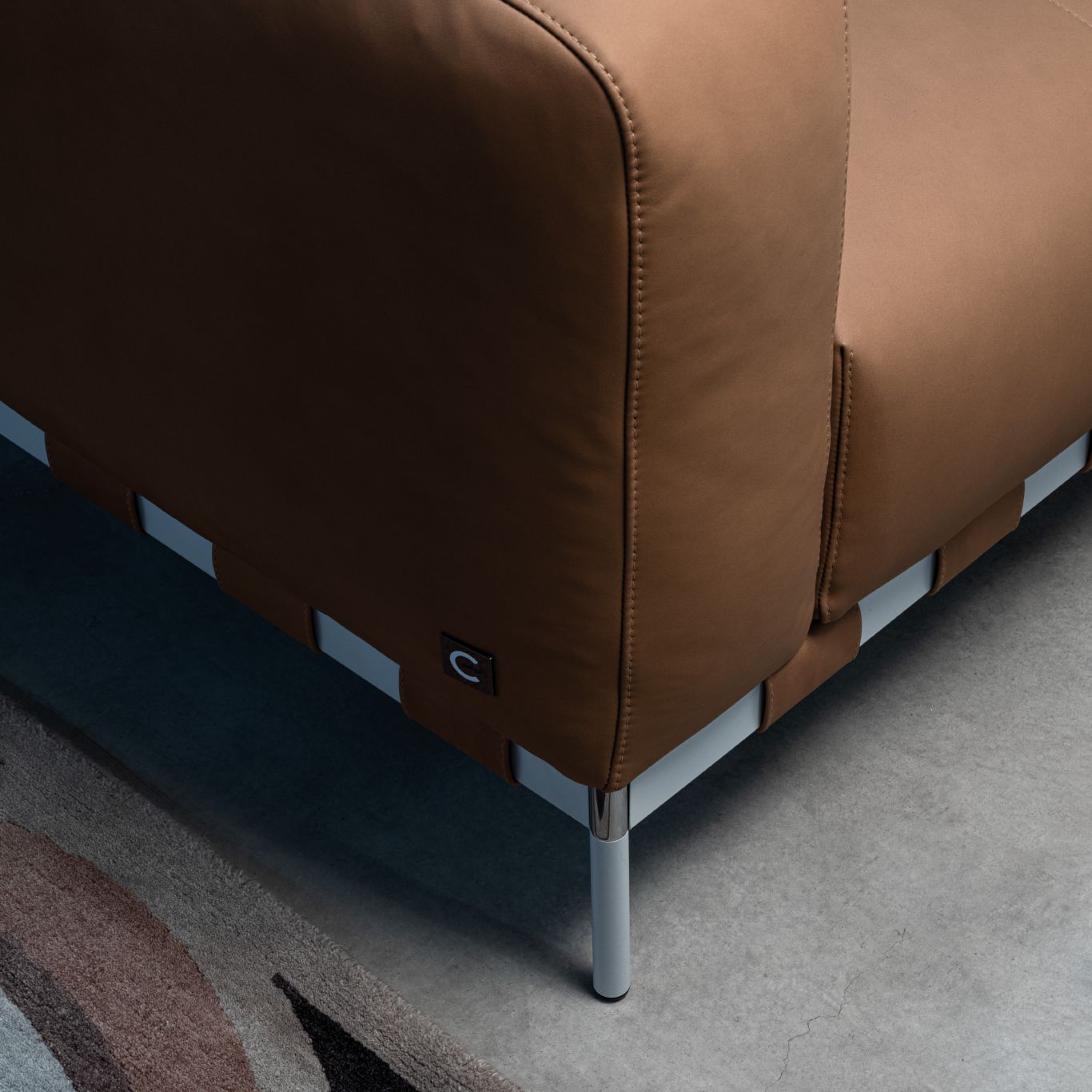 Divano elegante e moderno, con un’ampia gamma di elementi per comporre la configurazione che si desidera. Il meccanismo dello schienale consente di coniugare design e comfort. Il basamento è in metallo verniciato, la scelta possibile è tra 7 colori di RAL. Negli angoli del basamento c’è un angolo cromato, nelle tre finiture Nero, Lucido e Oro, che conferisce maggior prestigio alla composizione. Le cinghie in pelle della base, in tutti i colori disponibili del nostro campionario, creano un accattivante gioco di colore.
