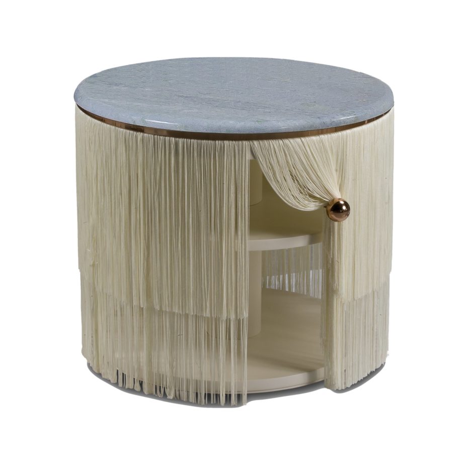 Struttura in legno laccato. Rivestimento con frangia. Maniglia e dettagli in metallo. Top in marmo.