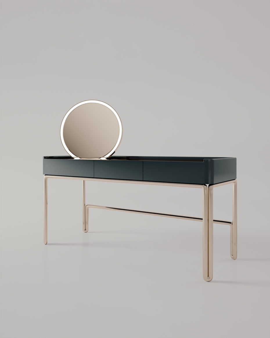 Base tubolare in metallo. Struttura in legno laccato. Interno cassetto laccato. Sistema di apertura push-pull.