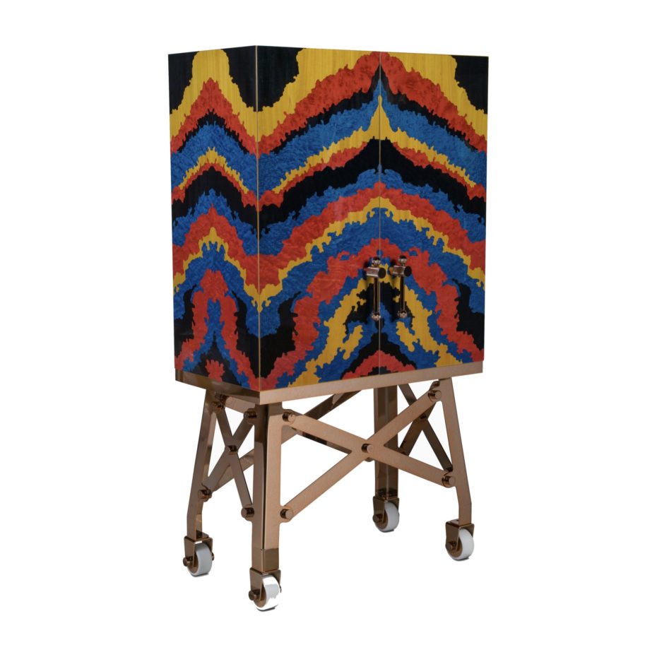 Struttura in legno listellare impiallacciata in finitura Mimetica. Interni e mensole laccate. Maniglie a morsetto in metallo. Base in metallo a forma di carrello con ruote.