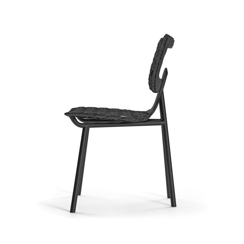 preted with a changed scale and leather as a material. Just as the look of a type font changes depending on its size, the traditional weaving used for A?rias also gains character due to the multiple enlargement of the pattern. The high sitting comfort results from the leather straps stretched on a wooden frame. Similar to the leather stretched on a drum, the result is flexing minimal surfaces absorbing the movements of the body and making sitting and leaning back especially comfortable.