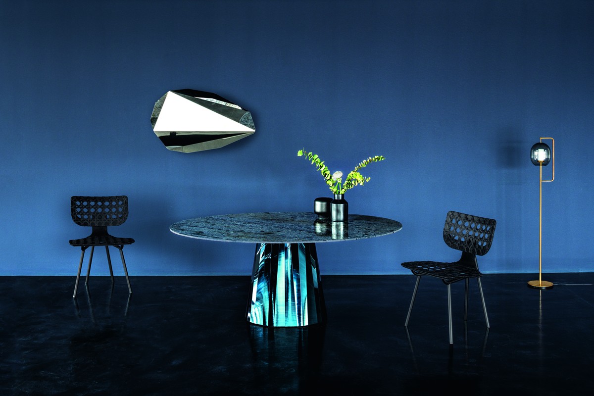 High-quality craftsmanship skills are required for executing the traditional weaving technique in this format with leather straps. The graphic appearance of the pattern is enhanced by the optional use of leather in two different colours. A?rias is an adaptable companion for various tables in private or public spaces. It is also suitable as an attractive stand-alone piece, with its leather weaving casting interesting shadows on its environment.