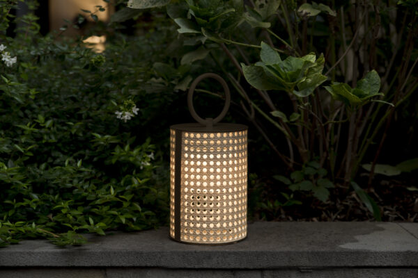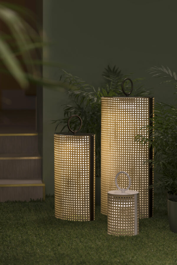 Il metallo laccato e la texture che richiama la paglia di Vienna sono evocativi di uno stile italiano raffinato trasferito anche in ambiente outdoor. Il diffusore, infatti, è stato realizzato in resina effetto paglia di Vienna impermeabile e con trattamento contro i raggi UV. Grazie alla sua natura ibrida, tra esterno e interno, tra retrò e moderno, la linea Clara offre un'illuminazione versatile, dinamica e trasversale.