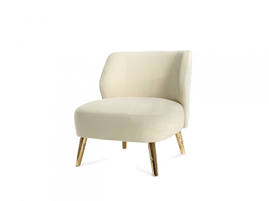 The enveloping and comfortable armchair Marilou can be upholstered only with selected textured fabrics. The backside is characterized by a quilting embroidered with hexagonal design. The bronze metal legs are realized with the ancient sand casting technique that conveys an artistic touch to the armchair.