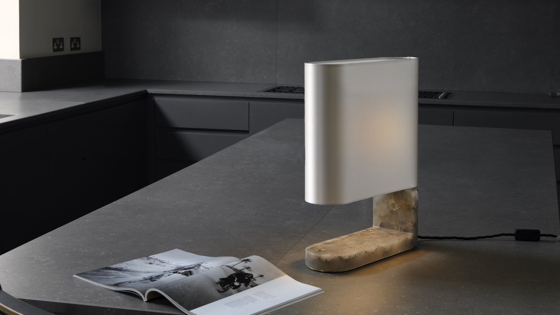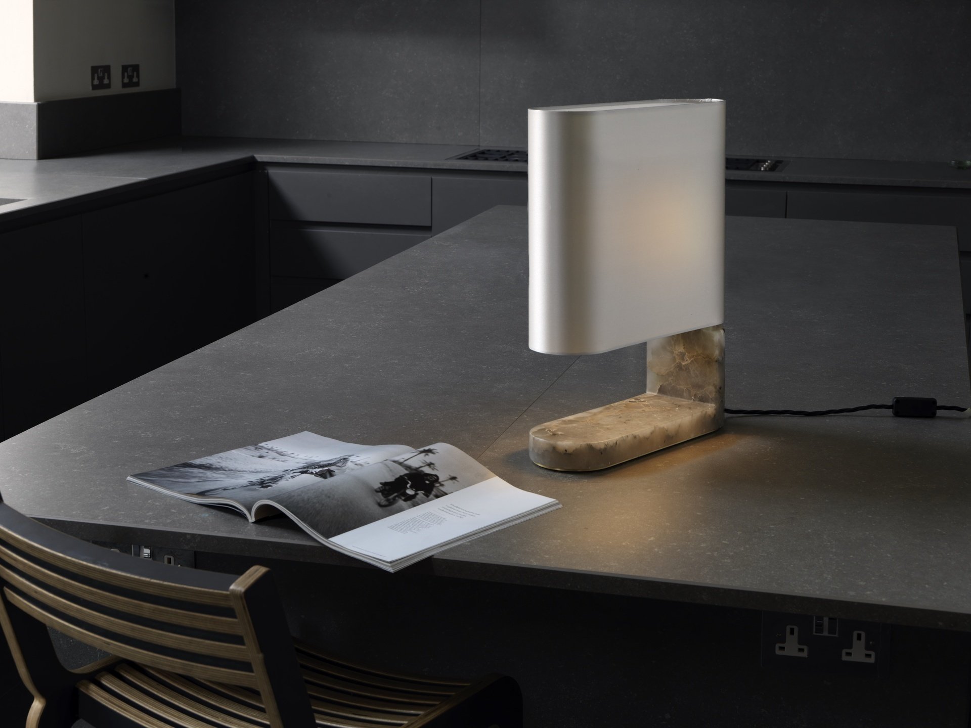 A truly unique light. Luxurious veined alabaster is hand cut and polished and is a thing of natural beauty and texture. Its curved form and translucent nature allows light to filter through adding a lightness that belies is obvious weight. Detailed with a brass plinth, a compact design for tables, consoles and desks.