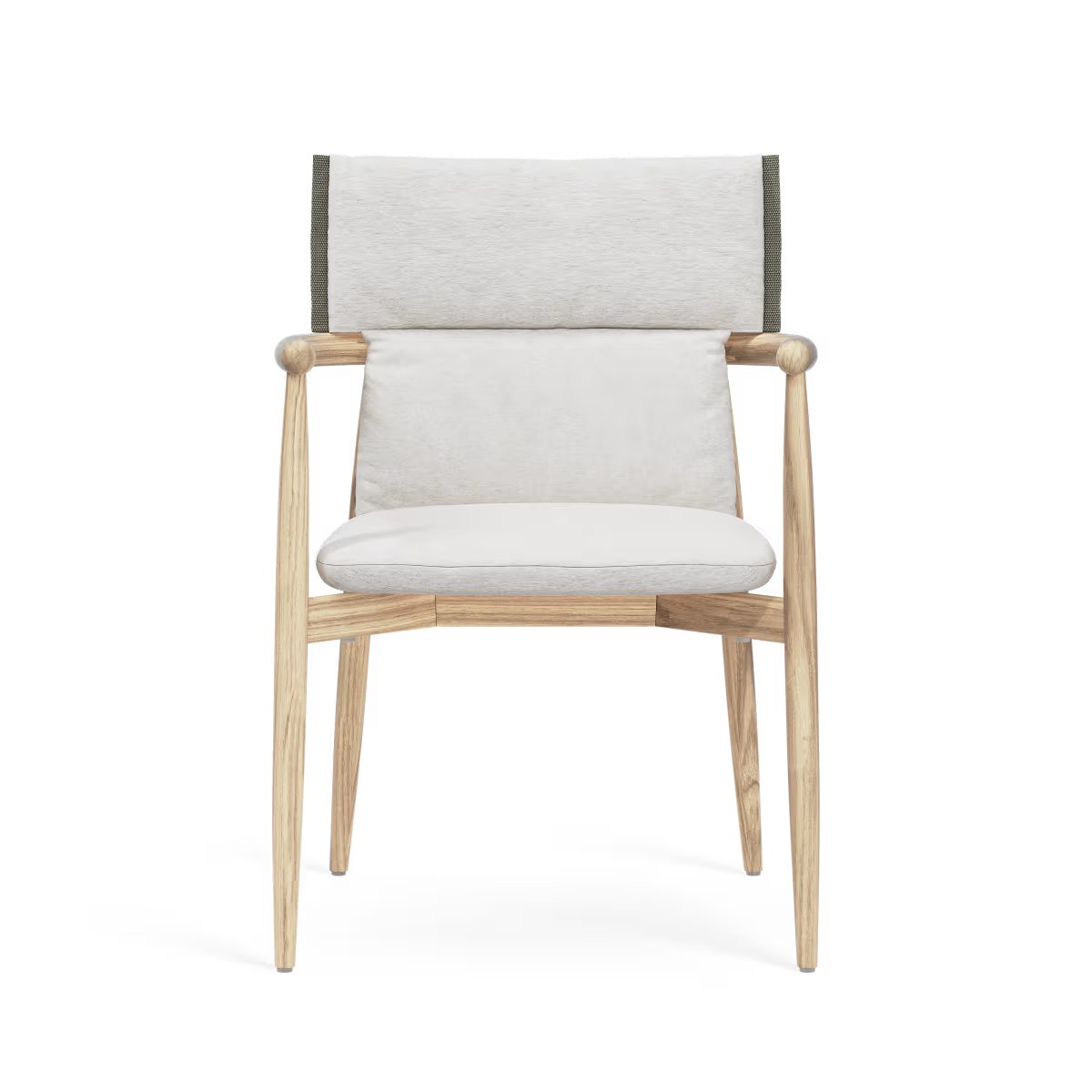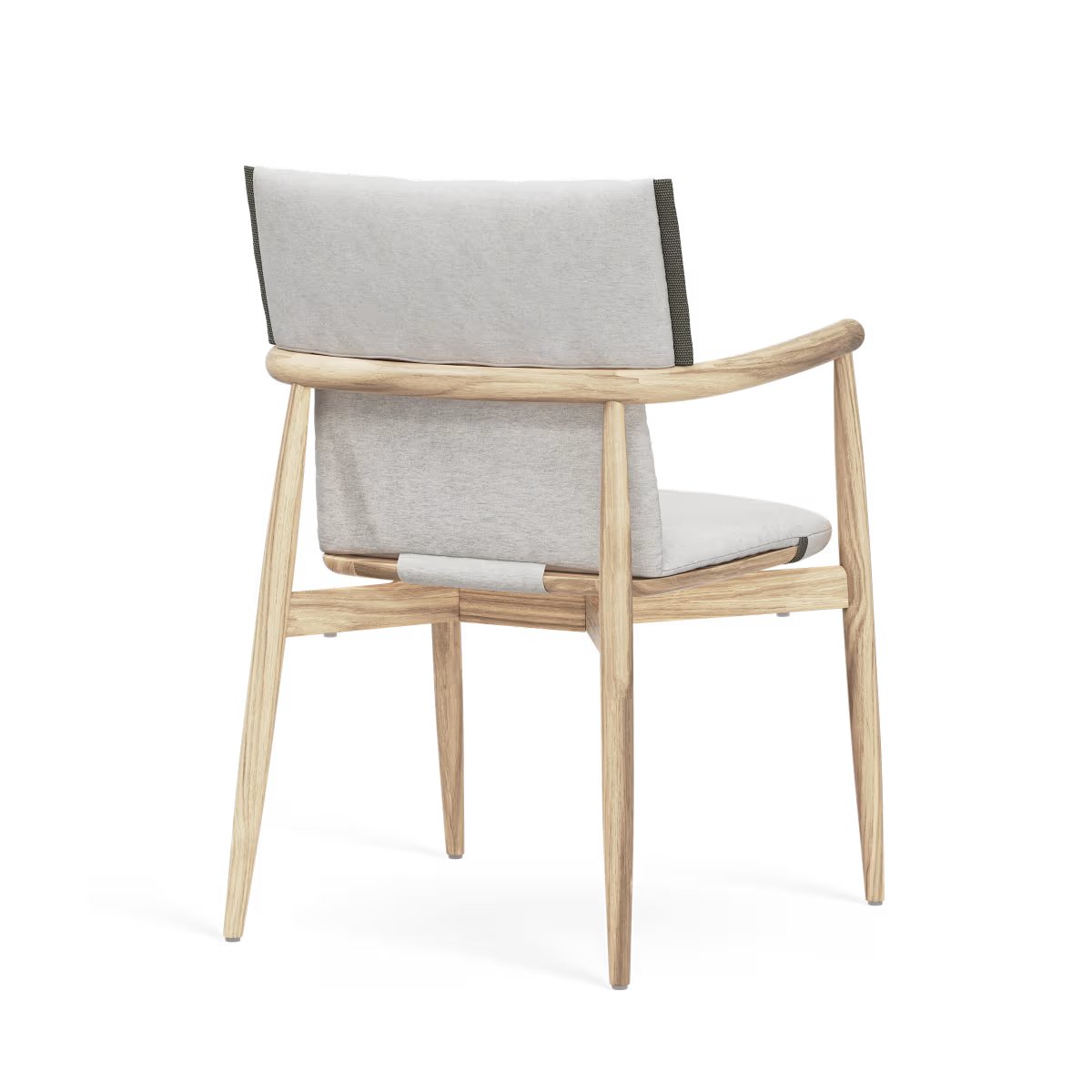 adds an elegant contrast to the sleek wood while almost resembling a piece of furniture for the indoors. When the chair is used without a cushion, the teak wood takes on a more prominent role in the design. The fabric has a fluorine free finish and a high degree of durability.