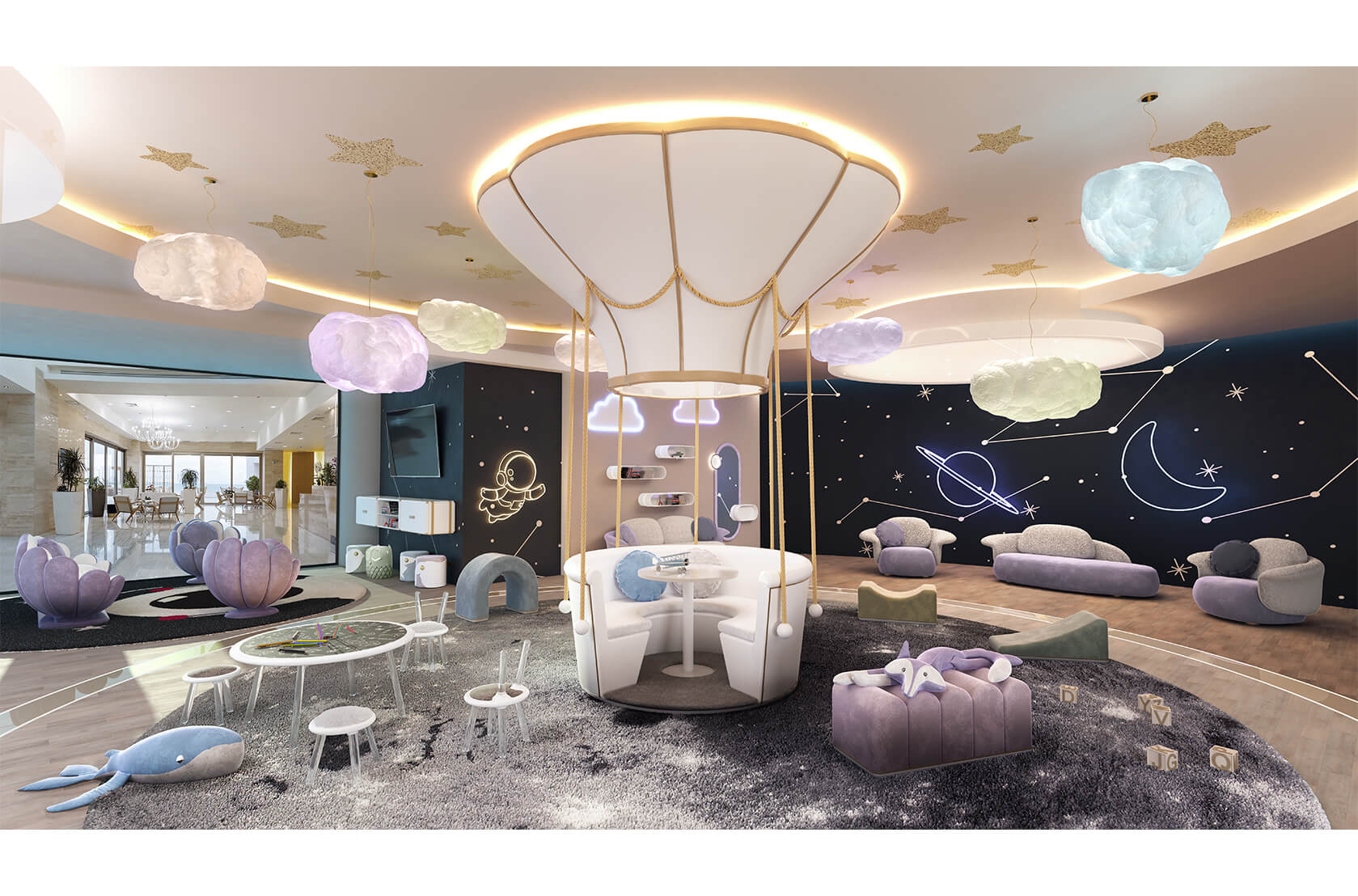 Fantasy Air Balloon Lounge is a themed lounge area, comprised of a marvellous circular sofa, so comfortable that you’ll be seated literally in the clouds, and a practical round table. This lounge set invokesthe romantic and whimsical ambience of a hot air balloon ride while being the perfect spot for yourkids to study, play or simply rest after a school day. The set features and colour-changing light andsound system on the top part, and due to its unique design can be easily used in any type of set, froma kids room to a commercial or larger-scale project.
