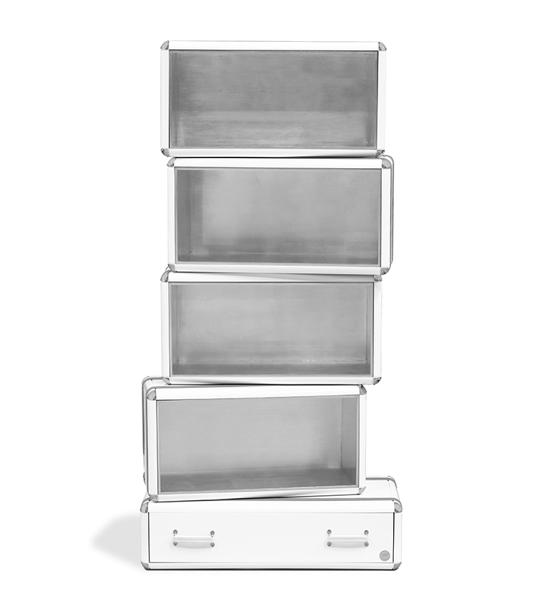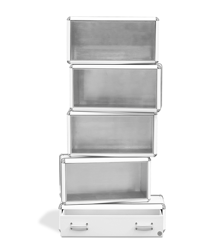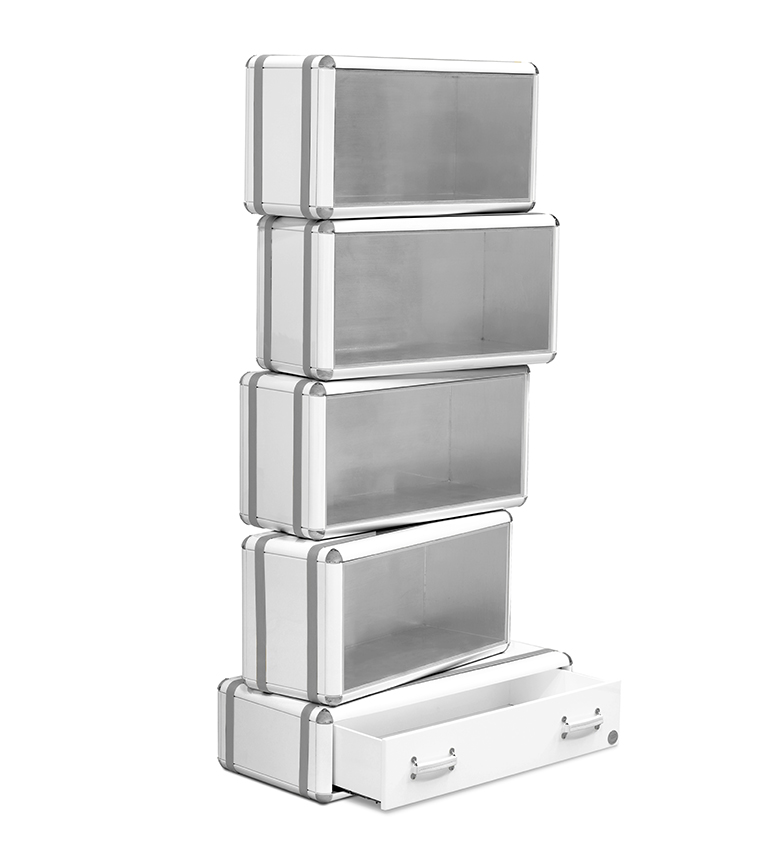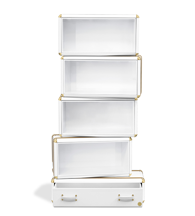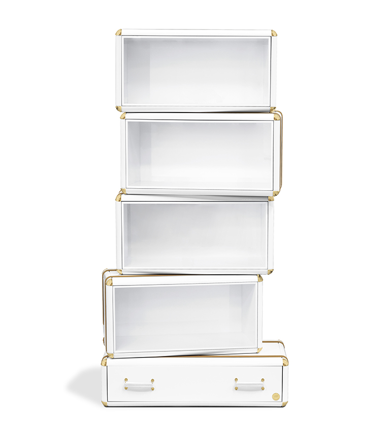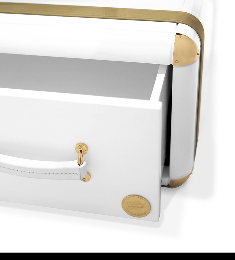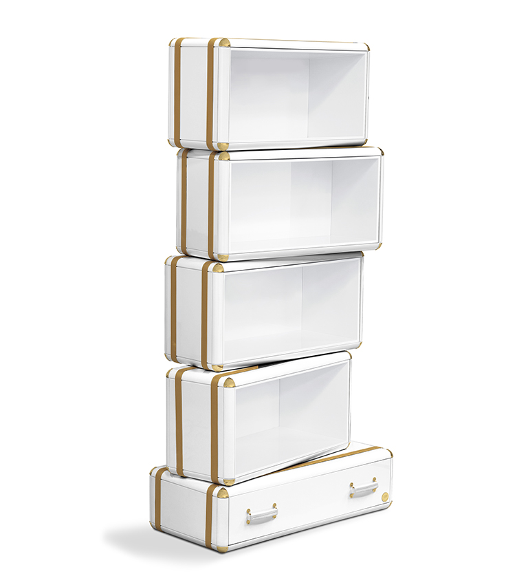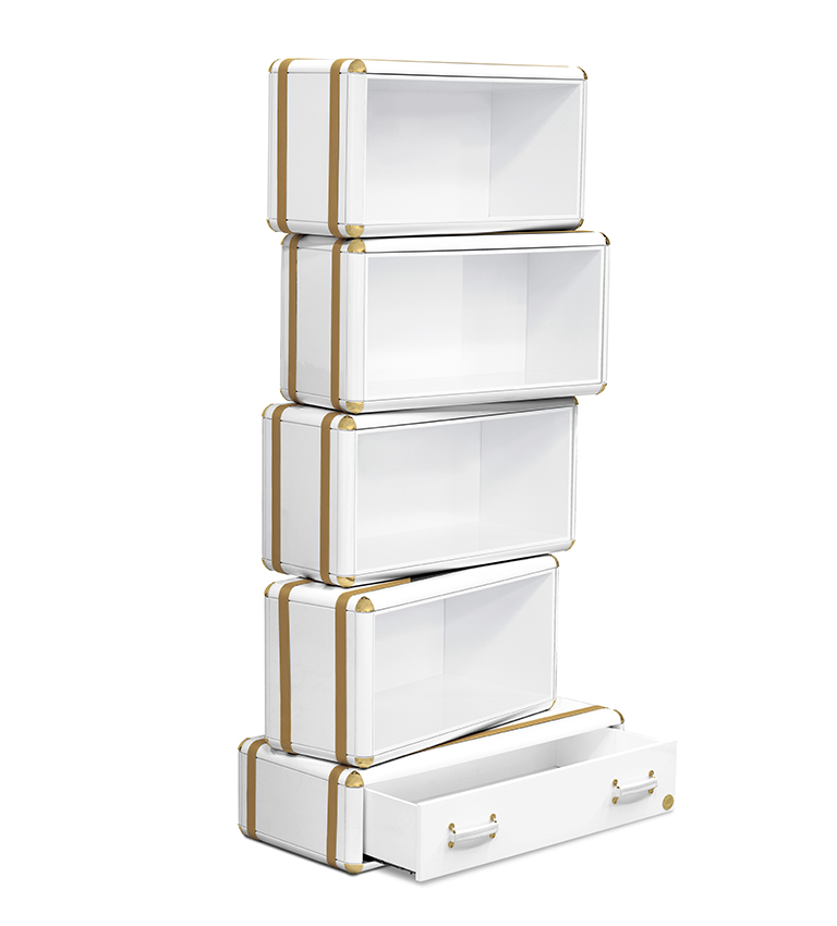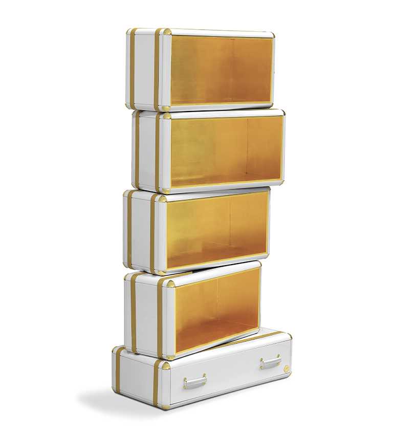 The limited edition exclusivity is provided by the gold leaf applied on the shelves that gives a luxurious look to the item. Built in wood, lacquered in glossy white, with details in synthetic leather and gold plated finishes.