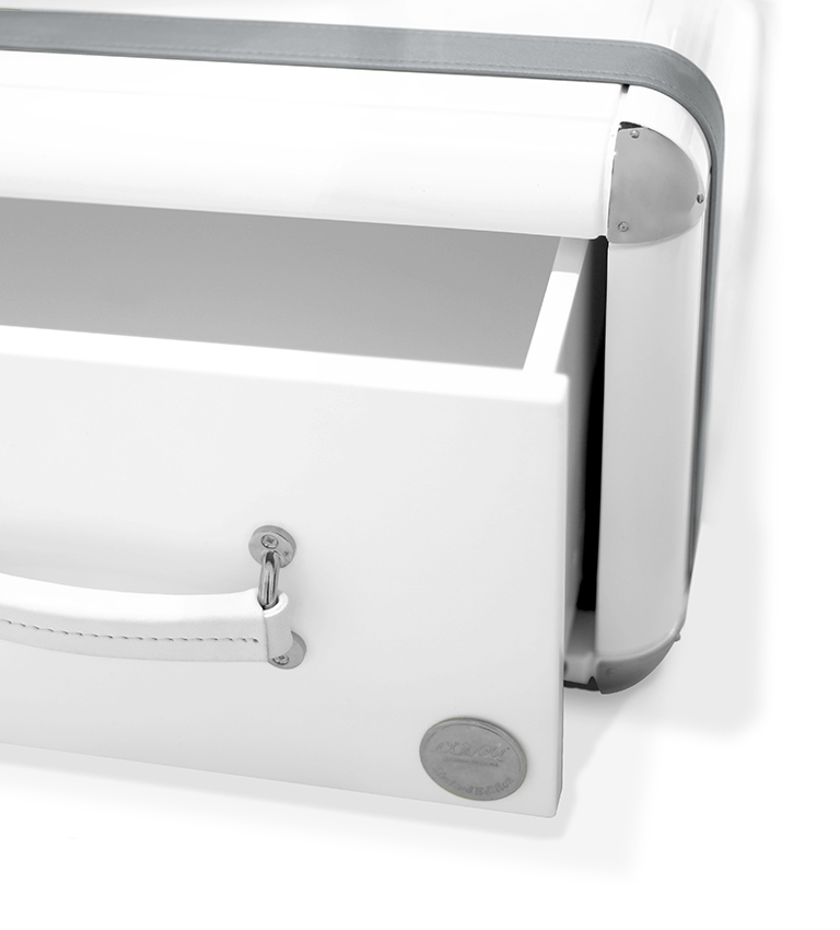 Lacquered in glossy white, Metal parts in Gold Plated finishing, Strips in Gold synthetic leather