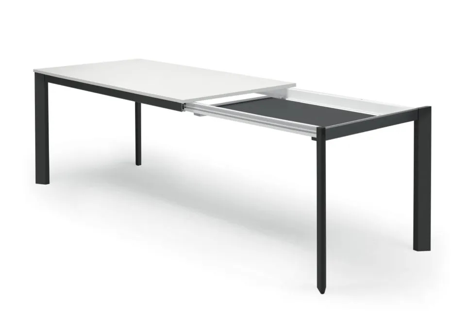 Iris is a modern extendable table with a telescopic opening and rests on four painted metal legs with 45° angles. The material and colour of the tabletop can be customised.