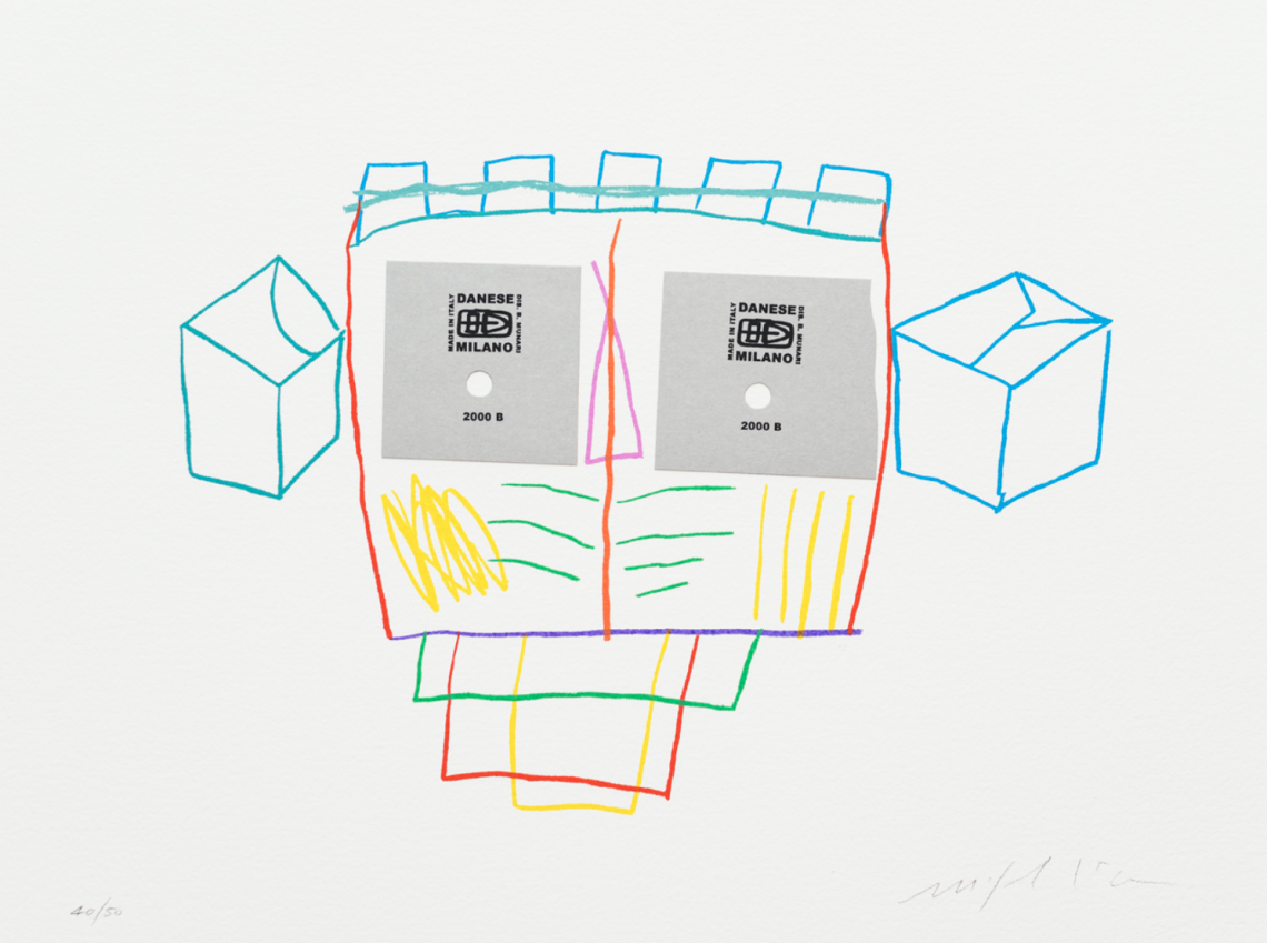 I volti, sei is a limited edition nine-colour silkscreen print. The series of prints entitled “I Volti” is inspired by the video “Giocosa Mente”, “a work for moving images” created by Paladino as a tribute Bruno Munari for the 100th anniversary of his birth. With simple, bright coloured marks and lively shapes that express both energy and emotion this print emits that sense of playful creativity that was typical of Munari’s work.