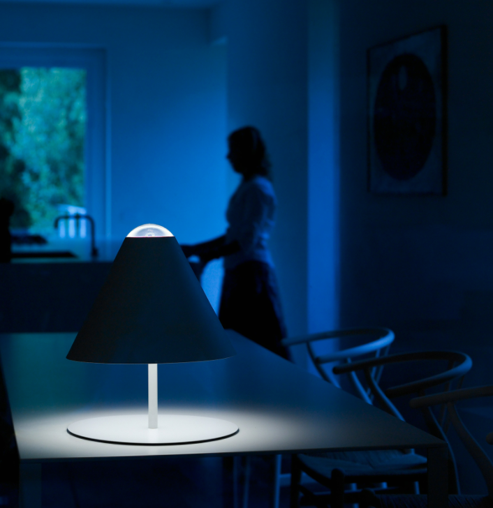The bulb is not shielded but displayed, and it peeks out from the aluminium shade. Floor version available.