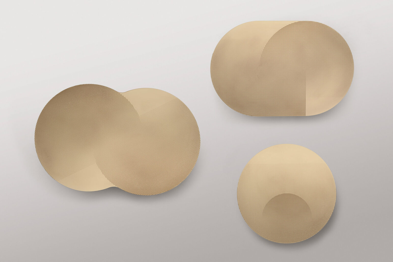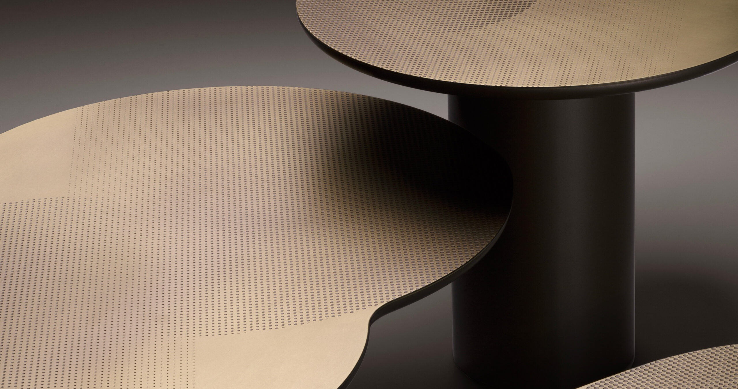 La collezioni di tavolini Flocks si ispira al movimento sinuoso e ipnotico degli stormi nel cielo autunnale. I top dei tavolini sono realizzati in lastra di ottone o rame, dalle forme circolari semplici o intersecate, che poggiano su uno o due cilindri di diversi diametri. Il contrasto cromatico è accentuato dal pattern grafico ottenuto con la finiture DeErosion che caratterizza il top regalando una sensazione tattile tridimensionale che affiora sulla lastra con naturale raffinatezza.