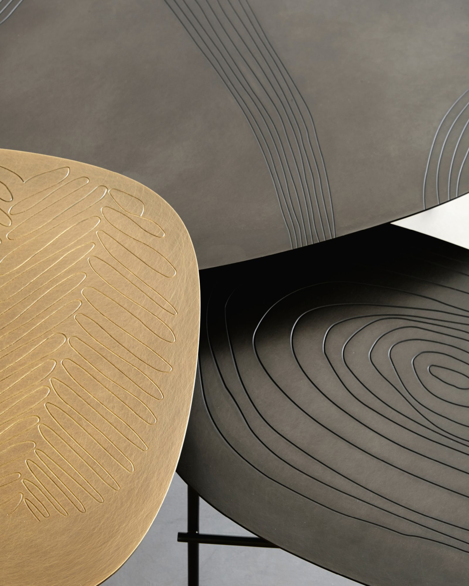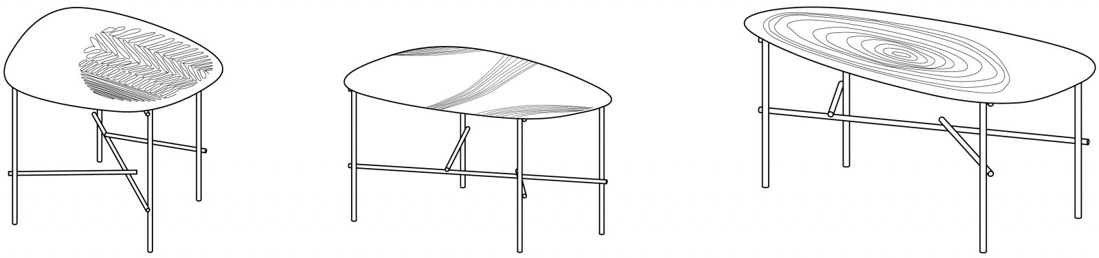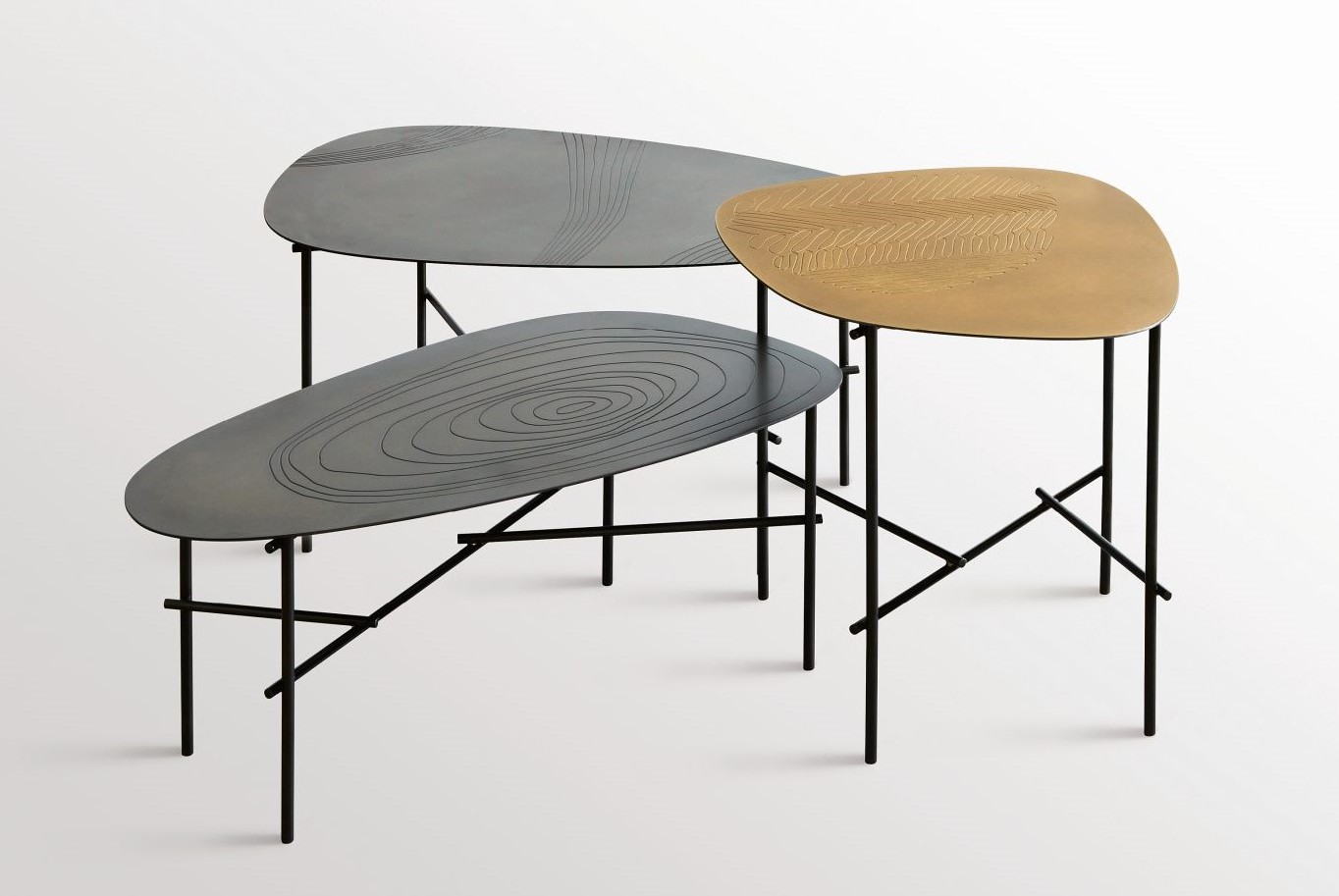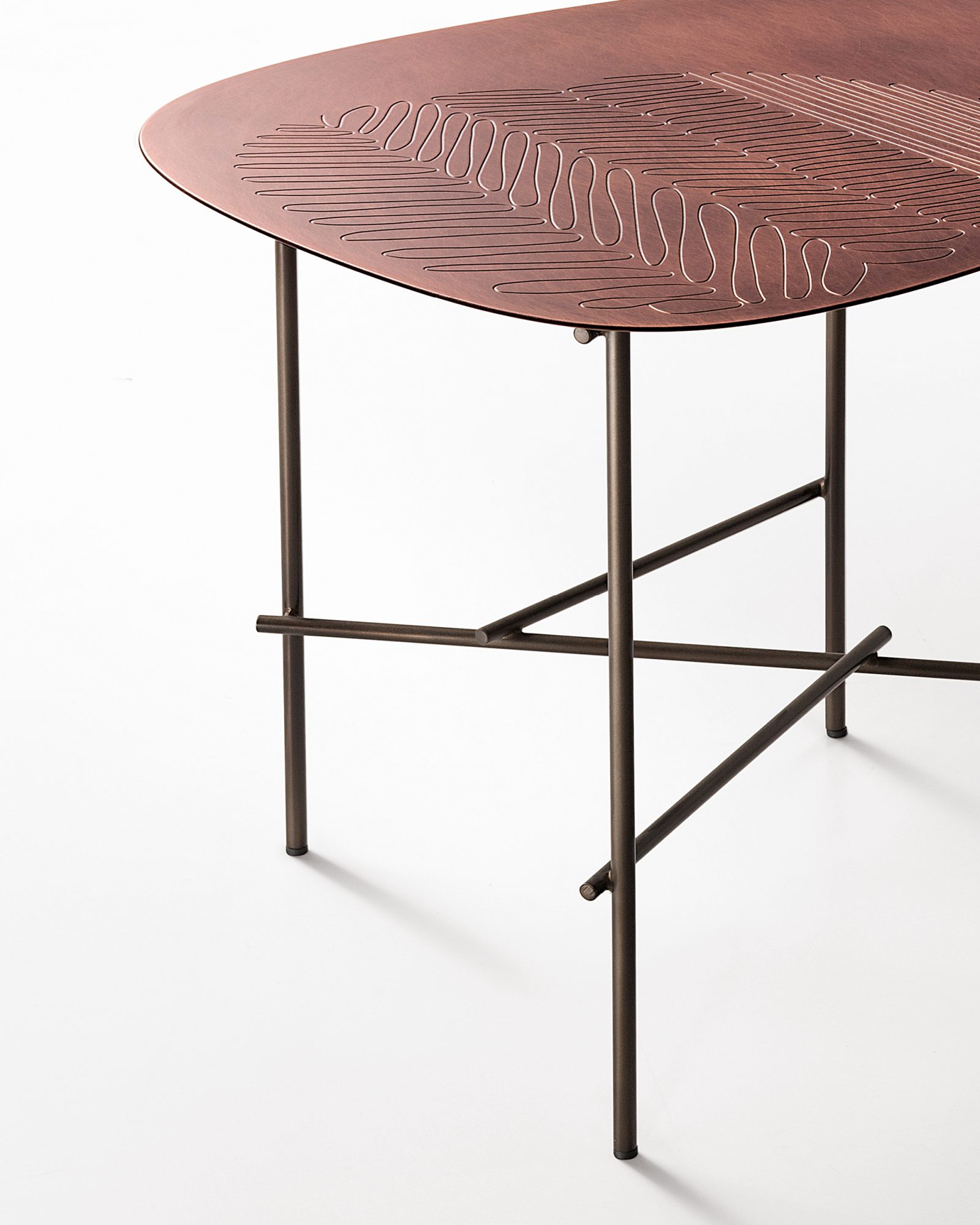 In organic shapes, this triptych of small tables is supported by a slender rebar structure and characterized by geometric shapes etched on the sheet metal tops. Flowing forms, almost primitive markings, material combinations and chromatic variations combine: iron, brass and copper are mixed repeatedly with shapes inspired by circles that branch out into the water, into the flowing current and the rippling waves. The connecting bars of the frame, positioned at the same height from the ground, form a natural weave, like branches of the same plant, in a fluid, balanced composition.